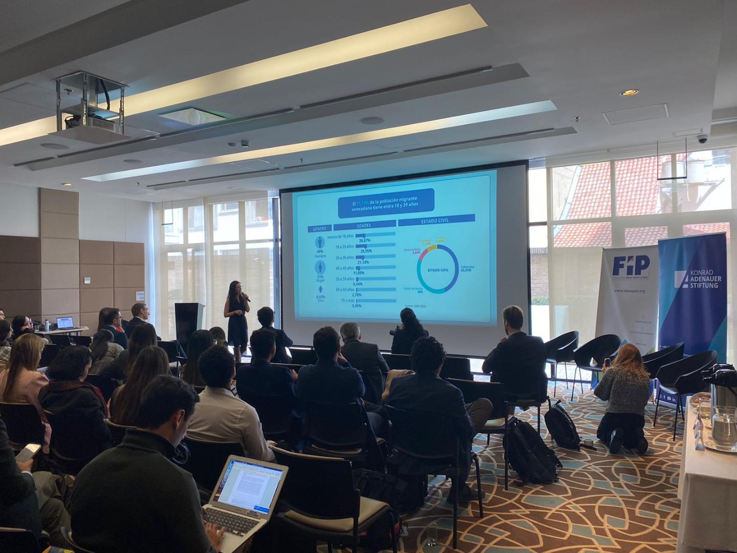 Im Anschluss an das Panel vertiefte das Team von Equilibrium die Interpretation der Umfrage-Ergebnisse bezüglich der Migranten; an der Diskussion nahmen zahlreiche Vertreter der Zivilgesellschaft, nationaler und internationaler Organisationen, staatliche Agenturen und Akademiker teil. So bemerkte die Direktorin für Migrationsprojekte von Equilibrium, Catalina Arenas, dass fast 80% der venezolanischen Migranten im arbeitsfähigen Alter seien, aber nicht in ihren erlernten Berufen oder formellen Arbeitsverhältnissen arbeiten könnten. Wenn Kolumbien diese Personen formalisieren und legalisieren könnte, würde das zu erhöhten Steuereinnahmen führen und innerhalb eines Jahres könnten ca. 4 Millionen Dollar zusätzlich eingenommen werden. Es folgte eine Fragerunde mit einer regen Beteiligung des Publikums.