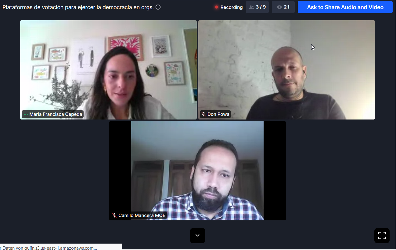 Camilo Mancera von der Mission zur Wahlbeobachtung MOE betonte, dass viele Organisationen Wahlen organisierten, ohne die Bedeutung der Umfragen, das Wahlgeheimnis oder den Datenschutz zu berücksichtigen. Um die besondere Problematik von internen Wahlen in privaten Organisationen zu lösen, habe die MOE ein Projekt für die alltägliche Demokratie entwickelt, um dadurch die Rechte der Bürger zu garantieren und die Mitbestimmung zu stärken.