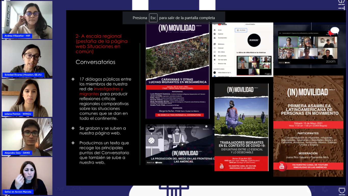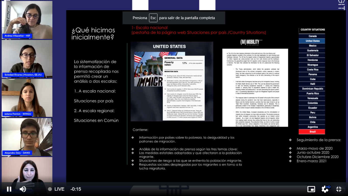 Die Vertreterin der Plattform „(In)Movilidad“, Soledad Álvarez berichtete, dass an dieser Initiative 40 Forscher mitarbeiten und die Dynamik der Migrationsbewegungen beobachten. Mit Hilfe dieser Plattform sollen Migranten und Binnenflüchtlingen auf einer mehrsprachigen Landkarte die politischen Strategien und Anforderungen in den einzelnen Ländern aufgezeigt werden; gleichzeitig könnten sie selbst daran mitarbeiten und Informationen über die Situation an ihrem jeweiligen Aufenthaltsort eingeben, um damit anderen Migranten zu helfen.