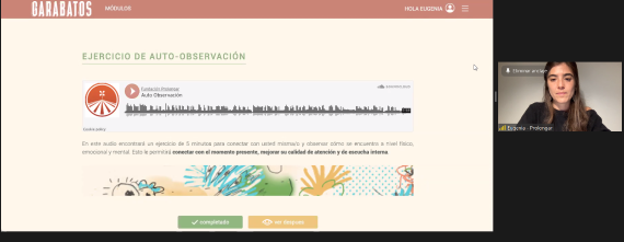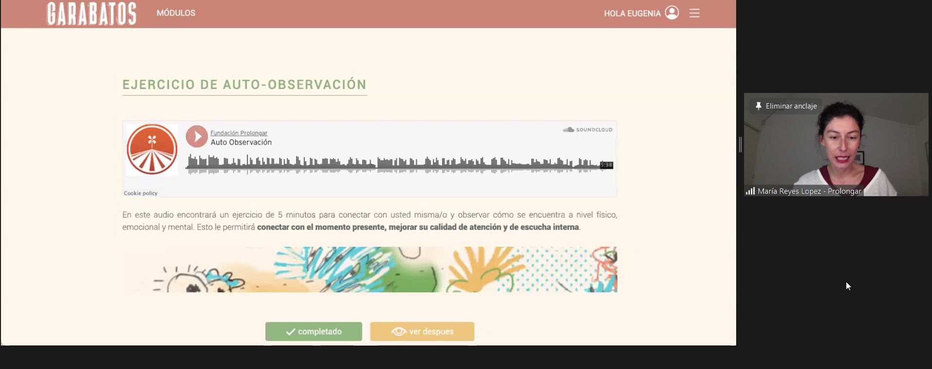 Die Trainerin Eugenia Echeverri präsentierte den “Werkzeugkasten” und die drei Module zu den Themen Vorurteile, Kontrolle von Emotionen und Körperlichkeit, in denen jeweils mit verschiedenen Aktivitäten zur Erforschung und Analyse aufgefordert werde. Zunächst führte man eine Übung zur Selbstbeobachtung durch, die auf der Microsite der Fundación Prolongar zu finden ist. Dabei konnten die Teilnehmer fünf Minuten lang mit Hilfe eines Podcast ihren Körper mit ihren Gefühlen und Emotionen koordinieren und sich dadurch ein Bild von ihrer inneren Verfassung machen.