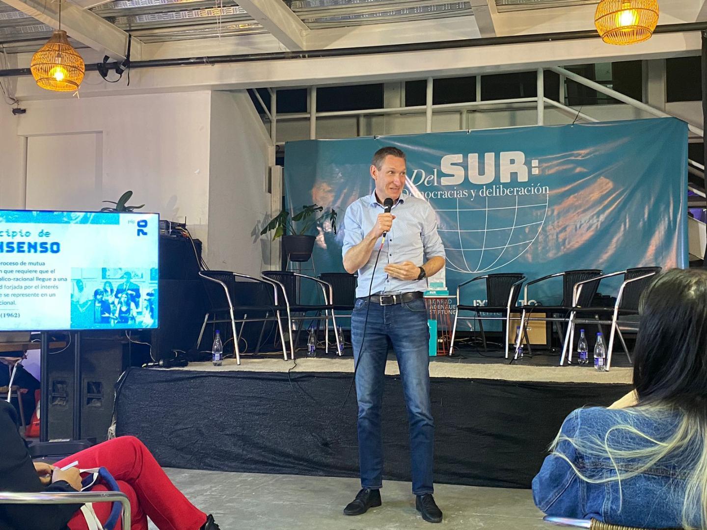 Zunächst dankte der Direktor und Mitgründer von Extituto, Nicolás Díaz, den Anwesenden für ihre Teilnahme und den Mitautoren für ihr Engagement bei der Erstellung der Publikation und der Organisation der Veranstaltung; dabei ging er auch auf die Bedeutung von deliberativen Prozessen sowie auf die Auswirkungen dieser Art der Beteiligung auf nationale und internationale Agenden und die Stärkung der repräsentativen Prozesse ein.