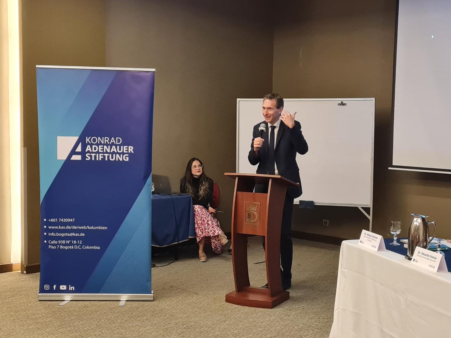 In seinen Grußworten dankte der Repräsentant der KAS Kolumbien, Stefan Reith, den Anwesenden für ihre Teilnahme und ging kurz auf die Arbeit der Stiftung zur Förderung von Demokratie und Partizipation sowie zur Friedenskonstruktion im Land ein. Dabei betonte er auch die Bedeutung von Beiträgen zur Analyse und Beobachtung der Außenpolitik in Kolumbien. Im Anschluss wurde eine Videobotschaft des Präsidenten des CRIES, Andrés Serbin gezeigt, der auch die Bedeutung einer Publikation hervorhob, in der die Außenpolitik der Regierung von Gustavo Petro analysiert werde, vor allem in einem so wechselhaften und aufgewühlten internationalen Kontext wie er momentan herrsche.