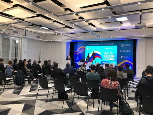 Luego de estas intervenciones se dio paso al primer panel del día sobre la perspectiva global de la migración venezolana en Colombia. Este panel contó con la participación de Stefan Reith, Simone Schwartz, representante adjunta de la ACNUR en Colombia, Ronal Rodríguez, investigador del Observatorio de Venezuela, en calidad de moderador, y Fernando Calado, director del programa integra de USAID. Dentro del panel se mencionó que Colombia contaba con una ventaja como país receptor al contar con una estructura institucional de atención humanitaria y la presencia de organizaciones internacionales para la atención del conflicto armado y el proceso de paz. Esta ventaja permitió que el país se posicionara como un modelo a nivel mundial en cuanto al desarrollo del sistema de protección temporal a migrantes y la regularización de estatus migratorio en medio de un éxodo sin precedentes de personas migrantes en la región latinoamericana. Por esto, la meta desde las organizaciones internacionales se trazó en función de consolidar la respuesta de emergencia. No obstante, se mencionó que ahora, el reto sobre la movilidad humana en Colombia será asegurar las condiciones básicas de vida para los migrantes en el proceso de regularización e incorporación a la actividad productiva formal, pues con las proyecciones presentadas por la gran encuesta nacional de migración, más del 60% de los migrantes venezolanos que se encuentran en el país, tienen vocación de permanencia.