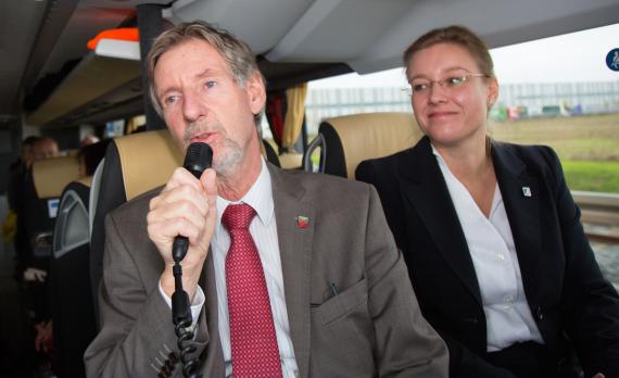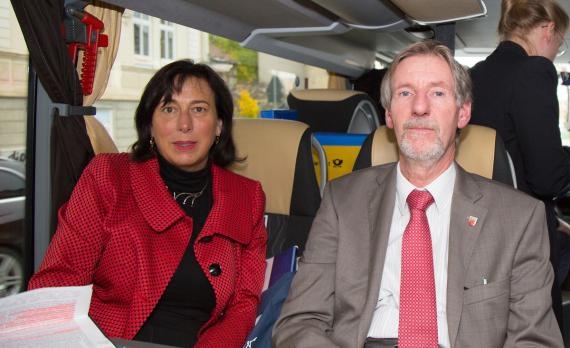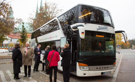 Am Anfang des diesjährigen Kommunalkongresses in Thüringen steht eine moderierte Exkursion durch Thüringen nach dem Motto "Auf den Spuren der Heimat". Auf dem Erfurter Domplatz ist gerade Markttag als sich der Bus mit rund 80 Insassen, darunter der Ehrenvorsitzende der Konrad-Adenauer-Stiftung und ehemalige Ministerpräsident Prof. Dr. Bernhard Vogel, Bundestagsabgeordnete und Erfurter Stadtverordnete Antje Tillmann (beide keine gebürtigen Thüringer, die sich aber dennoch dort heimisch fühlen), die Landesbeauftragte der Konrad-Adenauer-Stiftung für Thüringen Maja Eib sowie Landtagsabgeordnete, Stadträte und Kommunalverantwortliche aus allen Bundesländern, in Bewegung setzt. Von Erfurt, mit seiner mittelalterlichen Architektur und den herausgeputzten Fassaden geht es zunächst in das Gewerbegebiet Erfurter Kreuz. Seit der Wende hat sich Thüringen zu einem attraktiven Standort für Industrieunternehmen aus der ganzen Welt entwickelt. Neben Chemieunternehmen haben sich hier Logistikunternehmen, Metallverarbeitungsbetriebe und Photovoltaik-Hersteller niedergelassen. Auch Flugzeugtriebwerke von Rolls Royce werden im Gewerbegebiet Erfurter Kreuz generalüberholt. Weiter geht die Fahrt in Richtung Gotha, vorbei an mittelalterlichen Burgen, herbstlich verfärbten Wäldern und einer Teststrecke für Hochgeschwindigkeitszüge. In Gotha lernen wir, welche Kunstschätze im Herzoglichen Museum Schloss Friedenstein zu bestaunen sind und dass Kunst und Kultur im Freistaat Thüringen schon seit Jahrhunderten eine große Rolle spielt. Letzter Stopp der Exkursion sind die Obstplantagen auf den Fahner Höhen bei Gierstädt. Gestärkt durch frisches Obst und Saft aus regionalem Anbau geht es am frühen Nachmittag schließlich zurück nach Erfurt. Der Freistaat Thüringen in der Mitte Deutschlands hat sich in den letzten 25 Jahren enorm weiterentwickelt. „Wer die blühenden Landschaften hier nicht sieht, der hat beide Augen fest verschlossen“, fasst Maja Eib, Leiterin des Politischen Bildungsforums in Thüringen, zusammen.