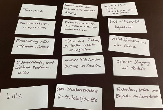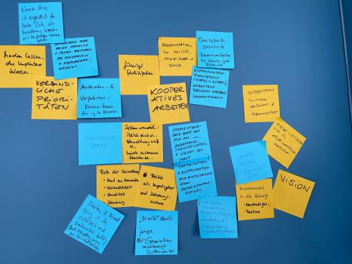 Hier erwies sich die Zusammensetzung des Teilnehmerkreises als besonders ergiebig, weil unterschiedlichste Expertisen und Erfahrungshorizonte zusammenkamen, die sich gegenseitig bereicherten: Fachlich reichte die Vielfalt von Ingenieuren (u.a. aus den Bereichen Bauen und Wirtschaft, Raum- und Umweltplanung) über Architekten, Kunst- bzw. Architekturhistorikern, Juristen bis hin zu Stadtplanern. Die Teilnehmenden arbeiten in Wirtschaft, Wissenschaft und Lehre oder in Kommunalverwaltungen (hier überwiegend in Stadtplanungsämtern), einige sind kommunalpolitisch aktiv und üben Funktionen wie Stadt- oder Regionalplaner, Bauleitplaner oder Transformationsmanager aus. In iterativen Schleifen – mal in 4er Stuhlinseln, mal locker im Raum verteilt, trugen die Teilnehmenden konkrete Ideen auf Metaplankarten, Post-it und Flipcharts zusammen.