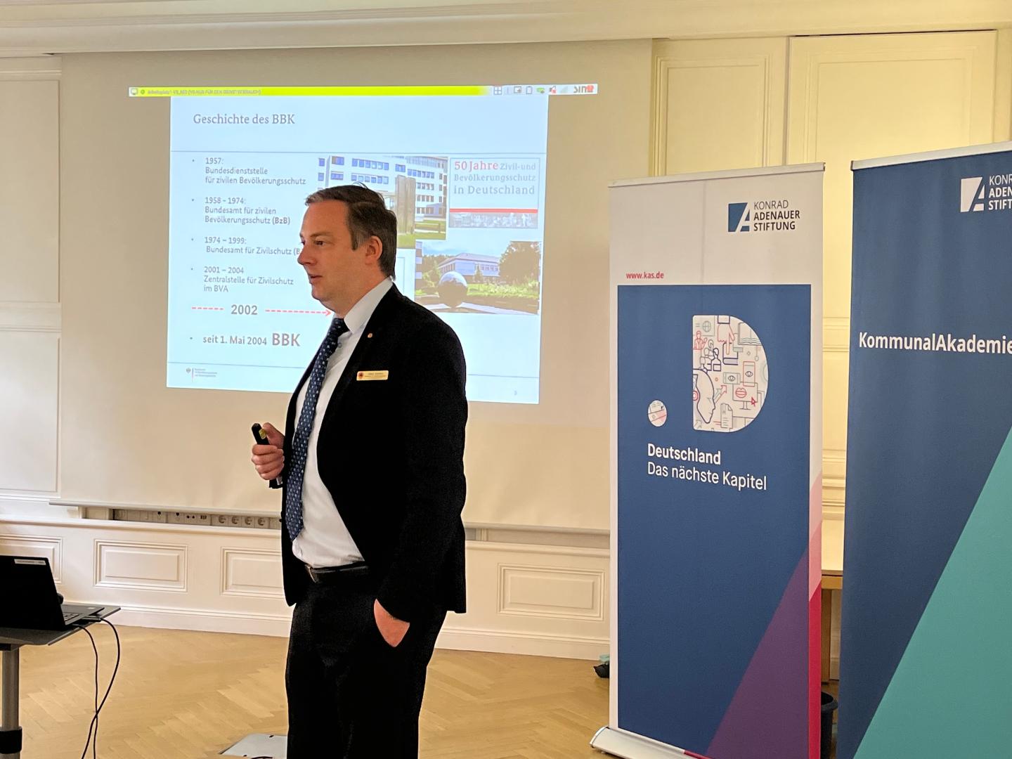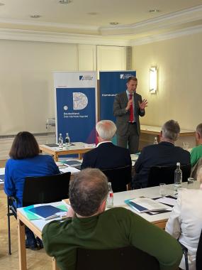Dr. Thorsten Klein, Journalist und ehemaliger Regierungssprecher im Kabinett der Ministerpräsidentin a.D. Annegret Kramp-Karrenbauer, ist inzwischen als Kommunikationsberater für unterschiedliche Institutionen aus Politik, Wirtschaft und Gesellschaft tätig und lieferte den Teilnehmern Einblicke in das Beratungsgeschäft, die er mit konkreten handwerklichen Tipps für erfolgreiche Krisenkommunikation anreicherte. Er ging außerdem auf das Zusammenspiel unterschiedlicher staatlicher Ebenen im Krisenfall ein und skizzierte die unterschiedlichen Zuständigkeiten. Dieser Themenkomplex wurde von Josef Kanders vom Bundesamt für Bevölkerungsschutz und Katastrophenhilfe vertieft. Er erklärte die Rolle, Möglichkeiten und Limitierungen von Bundesbehörden bei der Bekämpfung akuter Krisen. Diese und weitere Inputs lösten lebhafte und teils kontroverse Diskussionen bei den Teilnehmerinnen und Teilnehmern aus, und drehten sich u.a. um die Erfahrungen auf kommunaler Ebene mit den Auswirkungen des Hochwassers an Ahr und Erft im Sommer des Jahres 2021.