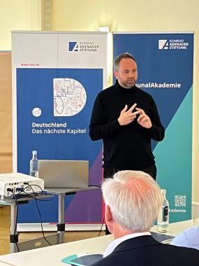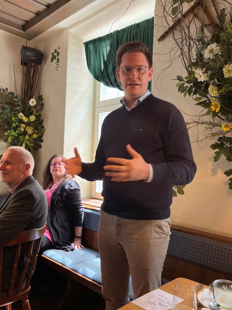 Im Rahmen eines Kurzimpulses während des Mittagessens begrüßte der örtliche Bundestagsabgeordnete Johannes Steiniger MdB die Teilnehmerinnen und Teilnehmer, führte zum Thema Krisenkommunikation aus und berichtete von seiner Arbeit im Bundestag.