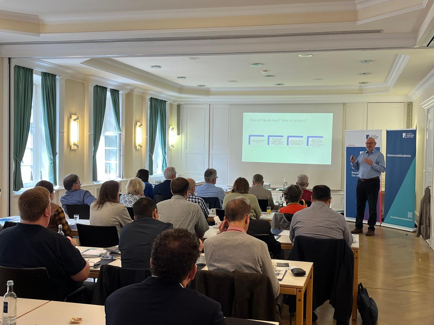 Das Vorstandsmitglied des Vereins Alt-Stipendiaten, Dr. Jürgen Bubeck, der auch an der konzeptionellen Vorarbeit für die Veranstaltung beteiligte war, stellte die Arbeit des Vereins der Alt-Stipendiaten vor und arbeitete dabei Bezüge zu kommunalen Themen und kommunalen Akteuren heraus.