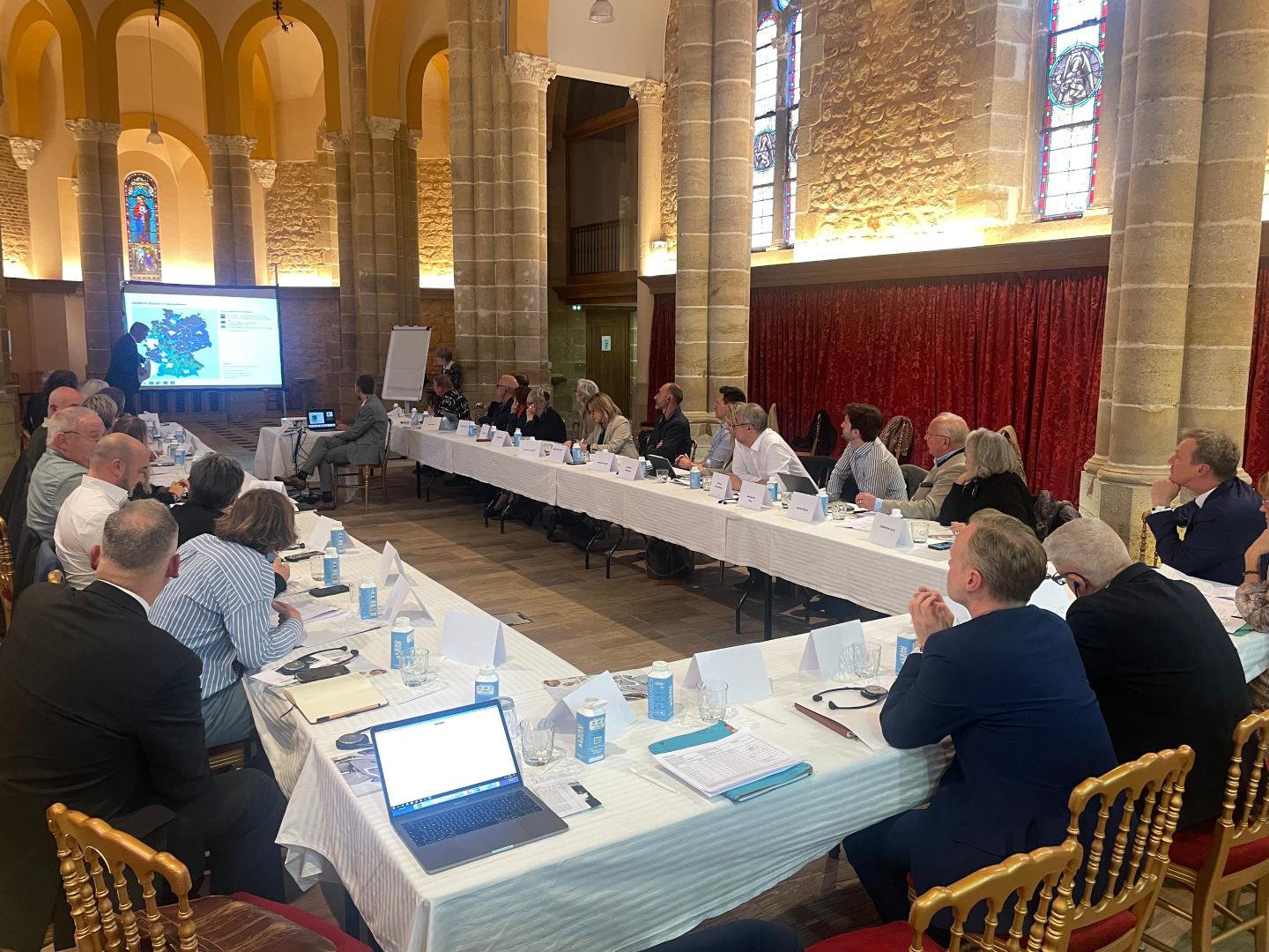 In Moulins-sur-Allier kamen die französische und die deutsche Delegation zu diversen Vorträgen sowie Debatten zusammen. In einer zum Tagungszentrum umgebauten denkmalgeschützten Kirche tauschten sich die rund 35 Teilnehmerinnen und Teilnehmer über deutsche und französische Perspektiven zu folgenden Themen aus: Windenergie, Kulturlandschaft und Tourismus; Gleichwertige Lebensverhältnisse – Herausforderungen für ländliche Räume; Lokale Solarenergieprojekte und überregionale Stromnetze; Zusammenspiel und Herausforderungen beim Weinbau und Naturschutz; Bodenversiegelung in ländlichen Räumen; Tourismus, Kultur, Landwirtschaft und Wertschöpfung am Beispiel der deutschen Bundesgartenschau; Lebensmittelproduktion im Klimawandel; Alte Teiche und neue Ideen für Wasserspeicher; Kulturlandschaft beleben – neue Ideen für alte Kirchen und Schlösser.