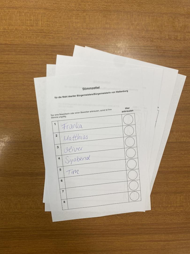 Hauptthema des ersten Tages war die Bürgermeisterwahl. „Ich habe gelernt, dass die Presse nervig ist“, war für die Wattenburger Presse „ein Kompliment“, schließlich begleitete sie schon ab Mittwochmorgen fleißig jede Regung der Fraktionen und Kandidaten bei Twitter. Nachdem die anderen Teilnehmenden erstmal fraktionsunabhängig basierend auf dem zuvor ausgewählten Beruf eine eigene Vita erarbeitet hatten, wurden anschließend zufällig Fraktionen eingeteilt. Während die einen losen mussten, wer denn ihr Bürgermeisterkandidat werden sollte, stand dies in anderen Fraktionen schnell fest. Neben kleinen Klüngeleien zwischen den Fraktionen waren es bei der anschließenden Bürgermeisterwahl doch die Reden der Kandidaten und deren Umgang mit kritischen Nachfragen, die einen klaren Wahlsieger hervorbrachten: Oliver.