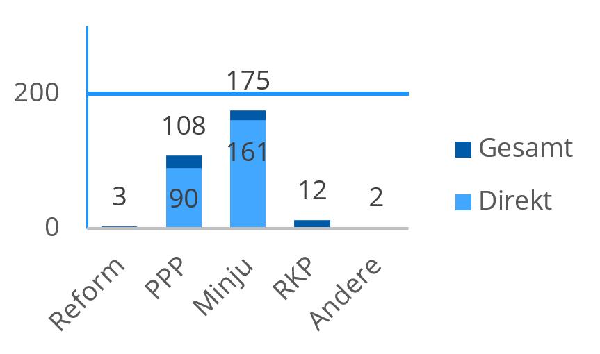 Die Minju vefügt nun über 161 Direktmandate sowie 14 zusätzliche Abgeordnete über die Verhältniswahl. Sie hat eindeutig die Wahl gewonnen, bei der letzten regulären Wahl 2020 hatte sie allerdings sogar 180 Sitze errungen.[i]
