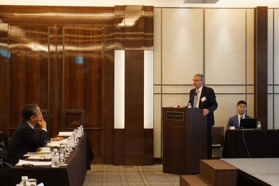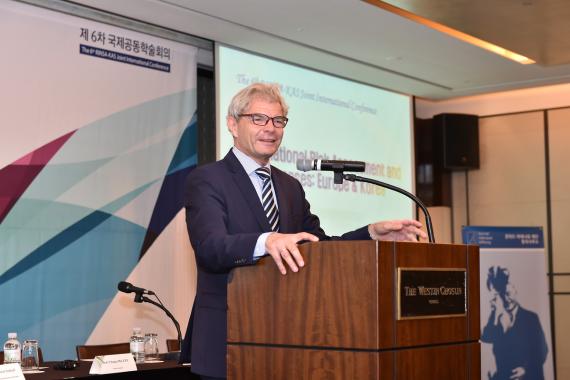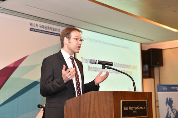 Die Konferenz eröffnete Stefan Samse, Leiter des Auslandsbüros Korea, der neben einem Grußwort und Dank an die Teilnehmer, die gemeinsamen Interessen Deutschlands und Südkoreas in Bezug auf aufkommende transnationale Risiken in Europa und Asien betonte. Im Anschluss an die Eröffnungsworte von Herrn Samse folgten Willkommensreden des RINSA-Präsidenten Prof. Dr. Seok-Soo Lee und des Generalleutnants Seung Ho Wee, Präsident der Korea National Defense University (KNDU). Beide Redner betonten die Bedeutung der langjährigen und erfolgreichen Zusammenarbeit von KAS und RINSA. Der deutsche Botschafter in der Republik Korea, Rolf Mafael, verwies in seinem Grußwort unter anderem auf das berühmte Zitat des ehemaligen amerikanischen Präsidenten Roosevelt: „Das Einzige, was wir zu fürchten haben, ist die Furcht selbst“. Roosevelt habe damit darauf hinweisen wollen, dass aufkommende Risiken nicht nur Grund für Beunruhigung geben, sondern auch als eine Herausforderung gesehen werden müssen, sich sicherheitspolitisch weiterzuentwickeln. Professor Emeritus Hwang Byeong Moo, der Korea National Defense University, hielt dieses Jahr die Grundsatzrede, in der er unter anderem die schwer einschätzbaren Fähigkeiten und die Intentionen Nordkoreas hinsichtlich Cyber-Attacken, Südkoreas Migrationspolitik im Zusammenhang mit nordkoreanischen Flüchtlingen sowie den MERS-Ausbruch im letzten Jahr als signifikante Risiken, thematisierte.