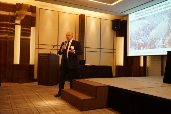 Der anschließende Vortrag von Oberst Andreas Jödecke, derzeit abgeordnet in die gemeinsame Taskforce von BMI und BMVg zur Bewältigung der Flüchtlingskrise, rückte die europäische Flüchtlingskrise und damit zusammenhängende Herausforderungen in Deutschland in den Fokus. Jödecke verdeutlichte zunächst das Ausmaß der Flüchtlingswelle des Sommers 2015, bei der täglich bis zu 15 000 Flüchtlinge hauptsächlich über die Balkanroute in Deutschland eintrafen. Ergänzend schilderte er die Versuche Deutschlands die Masse an Flüchtlinge organisatorisch in den Griff zu bekommen, wie zum Beispiel durch die Mobilisierung von Transportmitteln zur Verteilung von Flüchtlingen innerhalb Deutschlands und die Errichtung von ad hoc Einrichtungen zur Unterkunft. Zudem machte er auf den entscheidenden Einsatz der Bundeswehr aufmerksam, die kurzfristig dazu rekrutiert wurde, Flüchtlinge zu registrieren. Zudem verwies er auf zahlreiche Einsätze und Rettungsaktionen der Marine. Jödecke unterstrich vor allem die wichtige Einsicht, dass in dieser Situation vor allem Flexibilität und ein unmittelbares Reaktionsvermögen gefragt waren. Ein Risiko durch die Flüchtlingskrise bestehe darin, dass die Identität zahlreicher Flüchtlinge auf Grund des hohen Ansturmes und der schnellen Weiterleitung dieser, nur anhand weniger Informationen registriert wurde und die weitere Aufnahme und Verteilung von Flüchtlingen innerhalb der EU weiterhin umstritten ist.