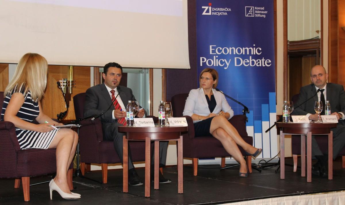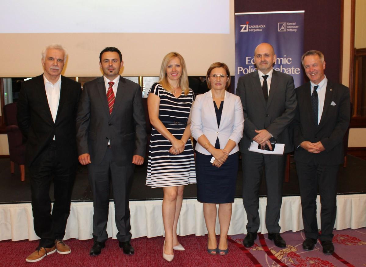 v. l. n. r. Prof. Dr. Mladen Vedriš (Zagreber Initiative, Rechtswissenschaftliche Fakultät der Universität Zagreb), Vjeran Vrbanec (Vorstandsvorsitzender von HAMAG-/BICRO), Vesna Torbarina (Kroatische Wirtschaftskammer, Leiterin des Europäischen Unternehmenszentrums in Kroatien), Ivana Radić (Virtuelles Frauen-Unternehmenszentrum), Želimir Kramarić (Vize-vorsitzender der Kroatischen Wirtschaftskammer) und Dr. Michael Lange (KAS Kroatien)