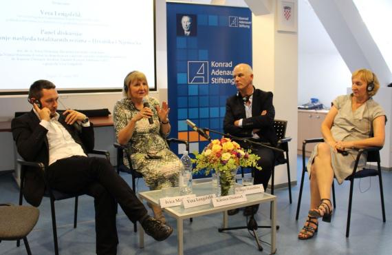 Paneldiskussion, v. l. n. r. Dr. Ivica Miškulin (Kroatische Katholische Universität), Vera Lengsfeld (ehemalige DDR-Bürgerrechtlerin und Abgeordnete im Deutschen Bundestag a. D.), Dr. Karsten Dümmel (KAS Bosnien und Herzegowina, ehemaliger DDR-Bürgerrechtler) und Višnja Starešina (kroatische Publizistin und Filmredakteurin, Zentrum für Demokratie und aktive Erinnerung)