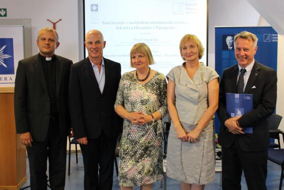 v. l. n. r. Prof. Dr. Željko Tanjić (Rektor der Kroatischen Katholischen Universität), Dr. Karsten Dümmel (KAS Bosnien und Herzegowina, ehemaliger DDR-Bürgerrechtler), Vera Lengsfeld (ehemalige DDR-Bürgerrechtlerin und Abgeordnete im Deutschen Bundestag a. D.), Višnja Starešina (kroatische Publizistin und Filmredakteurin, Zentrum für Demokratie und aktive Erinnerungen) und Dr. Michael Lange (KAS Kroatien)