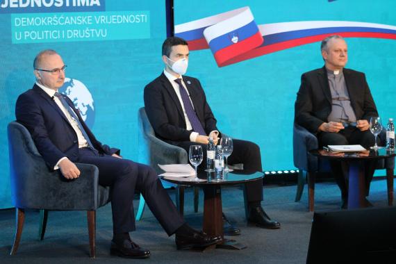 Dr. Gordan Grlić Radman, Minister für auswärtige und europäische Angelegenheiten der Republik Kroatien; Matej Tonin, stellv. Ministerpräsident und Verteidigungsminister der Republik Slowenien; Vorsitzender der Partei Neues Slowenien (NSi) und Prof. Dr. Željko Tanjić, Rektor der Kroatischen Katholischen Universität