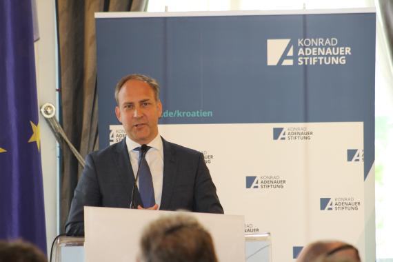 Der kroatische Wirtschaftsminister, Darko Horvat, sprach dann über die Rolle der KMU in Kroatien. Für ihn seien die Zahlen bezüglich der KMU in Deutschland und Kroatien ähnlich. Fast 99,3% aller Unternehmen in Kroatien seien Handwerks-, Kleinst- und Mittelbetriebe. Mehr als 60% der Beschäftigten würden in diesem Sektor arbeiten und 60% des Mehrwertes sei dort generiert. Allerdings gäbe es einen Unterschied, Kroatien schaffe hochwertige Arbeitskräfte für deutsche Unternehmer. Laut Horvat müssen wir uns dafür nicht schämen noch davon fürchten, denn wir sein Zeugen einer sog. legalen Wirtschaftsmigration, die immer vom Osten nach Westen verlaufe. Er erläuterte, dass viele Menschen, die ihr Berufsleben in Kroatien anfangen, irgendwann die Chance erkennen und nach einer besser bezahlten Arbeit im Ausland suchen, um wirtschaftlich einen Schritt nach vorne zu machen. Dabei gebe es einen großen Unterschied bei der Auswanderung der Kroaten von früher und von heute. Früher seine Menschen nach Deutschland wegen Zeitarbeit ausgewandert. Jetzt würden sie mit ganzen Familien auswandern und für immer im Ausland/Deutschland bleiben. Sein Anstreben sei, dass der administrative Teil der Arbeit seines Ministeriums von Rechnern erledigt werde, damit sie sich auf die Erkennung einer guten Idee fokussieren können. Durch die Digitalisierung des gesamten Systems würde man die Wahrscheinlichkeit von Korruption verringern. Leider würde man derzeit im Ministerium nicht strategisch nachdenken und sich hinterfragen, was man in zehn Jahren von Kroatien erwarte.