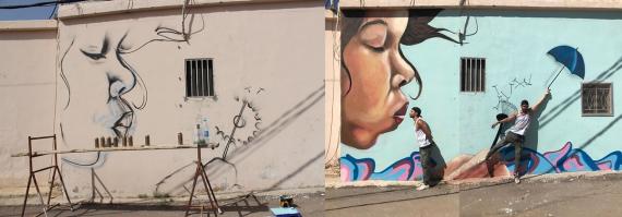 Die Motive der Graffitis zeigen dabei eine traditionelle Situation – zwei Frauen backen gemeinsam Brot –, sowie vier interaktive Bilder, bei denen der Betrachter entweder zur Marionette zweier überlebensgroßer Hände wird, sich mit Hilfe zweier Flügel zum Engel verwandelt, eine Pusteblume verwehen lässt oder einen Straus Blumen überreicht bekommt.