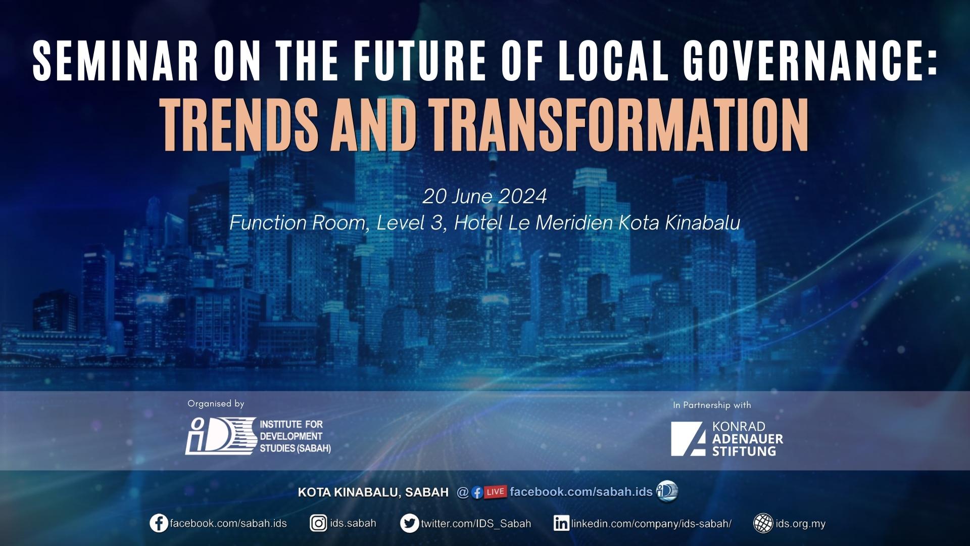 The future of local governance is a topic of paramount importance in the current global context. In today's rapidly changing global landscape, local governance faces unprecedented challenges and opportunities. Urbanization, technological advancements, climate change, demographic shifts, and evolving social dynamics are reshaping the way communities are governed. Therefore, it is essential to understand the emerging trends and transformations in local governance and envision a future where local governance is adaptive, inclusive, and responsive to the needs of all residents. This is vital for policymakers, scholars, and practitioners to navigate the complexities of local governance effectively and to understand the evolving landscape of local governance. It is also in line with one of the five enablers in Sabah Maju Jaya (SMJ), emphasizing the importance of excellent governance and the execution of strategies of SMJ and the Sabah Structure Plan 2033.