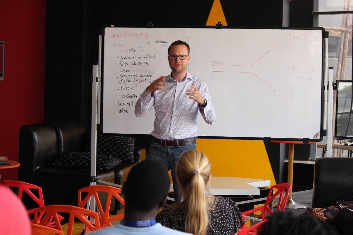Für den Vortrag des Kenianers Mark Kaiga am zweiten Tag stieß dann ein gutes Dutzend lokaler Blogger aus Uganda zur Gruppe. Der Experte für digitale Themen zeichnete ein eindrückliches Porträt vom rapide wachsenden Einfluss des Internets auf die Politik. Am Beispiel von ‘sock puppets’, ‘meat puppets’ und ‘armies of online militias’ erklärte er, wie bezahlte online Lobbyisten Fakeprofile in den sozialen Medien nutzen, um Nachrichten und die politische Meinung zu manipulieren.