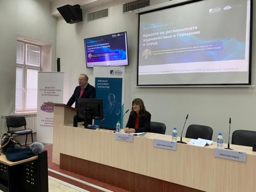 The event was opened by Assos. Prof. Svetlana Stankova, vice dean of the Faculty, and Christoph Plate, director of the Media Programme South East Europe who recalled that Konrad Adenauer himself was a great admirer of regional journalism and appealed to journalism students to be good at what they do. Special guest this time was Sebastian Turner, former advisor to the media group “Hotzbrinck, former publisher of “Tagesspiegel” and founder of the regional “Table-Media” in Berlin.