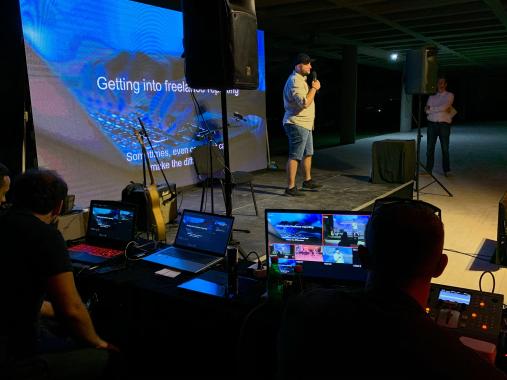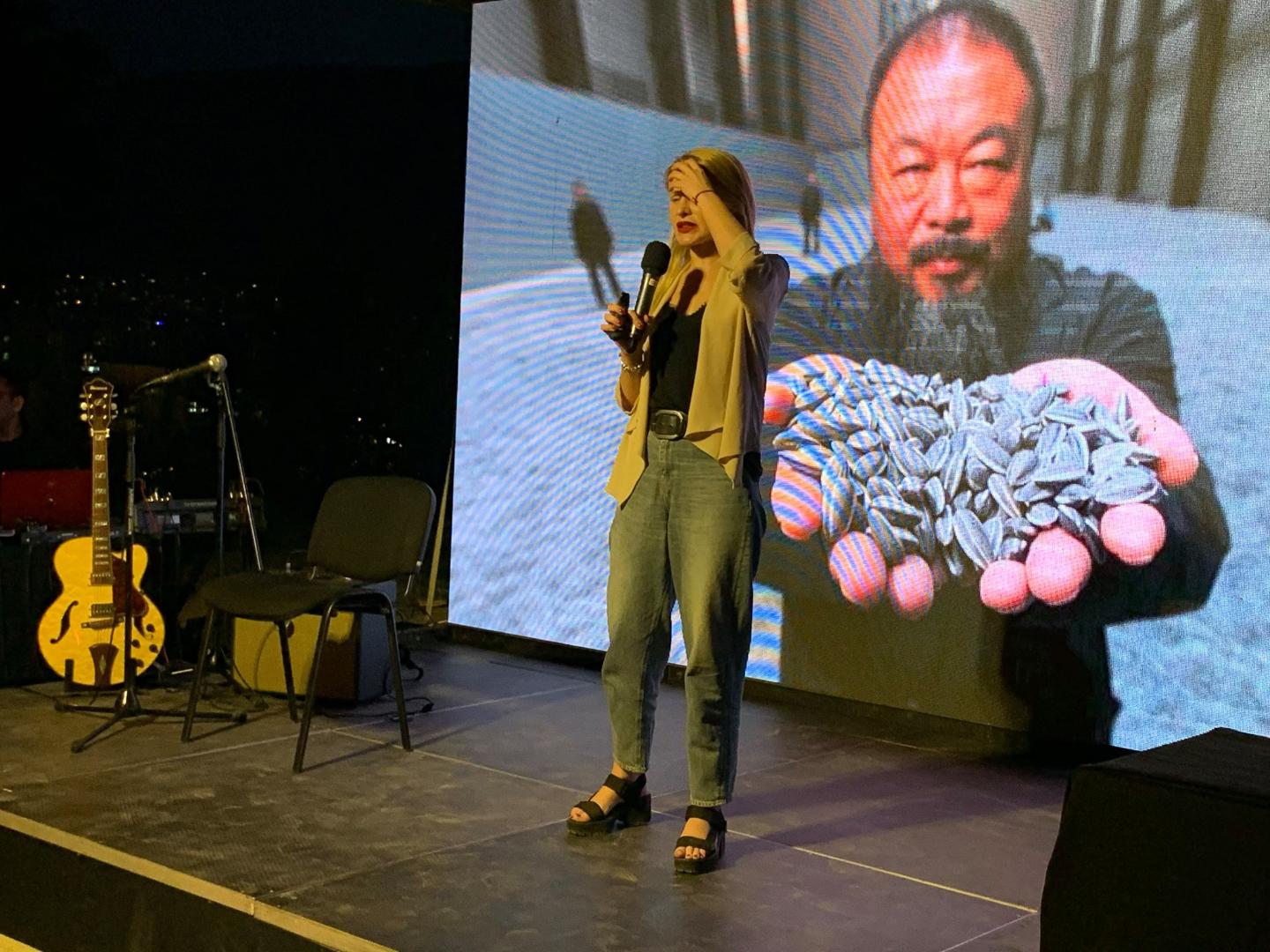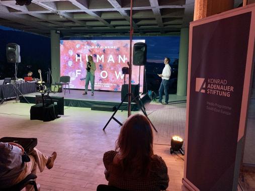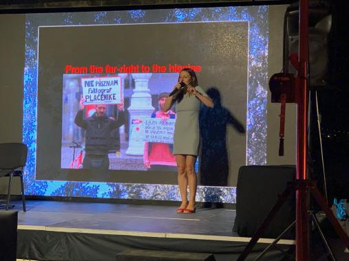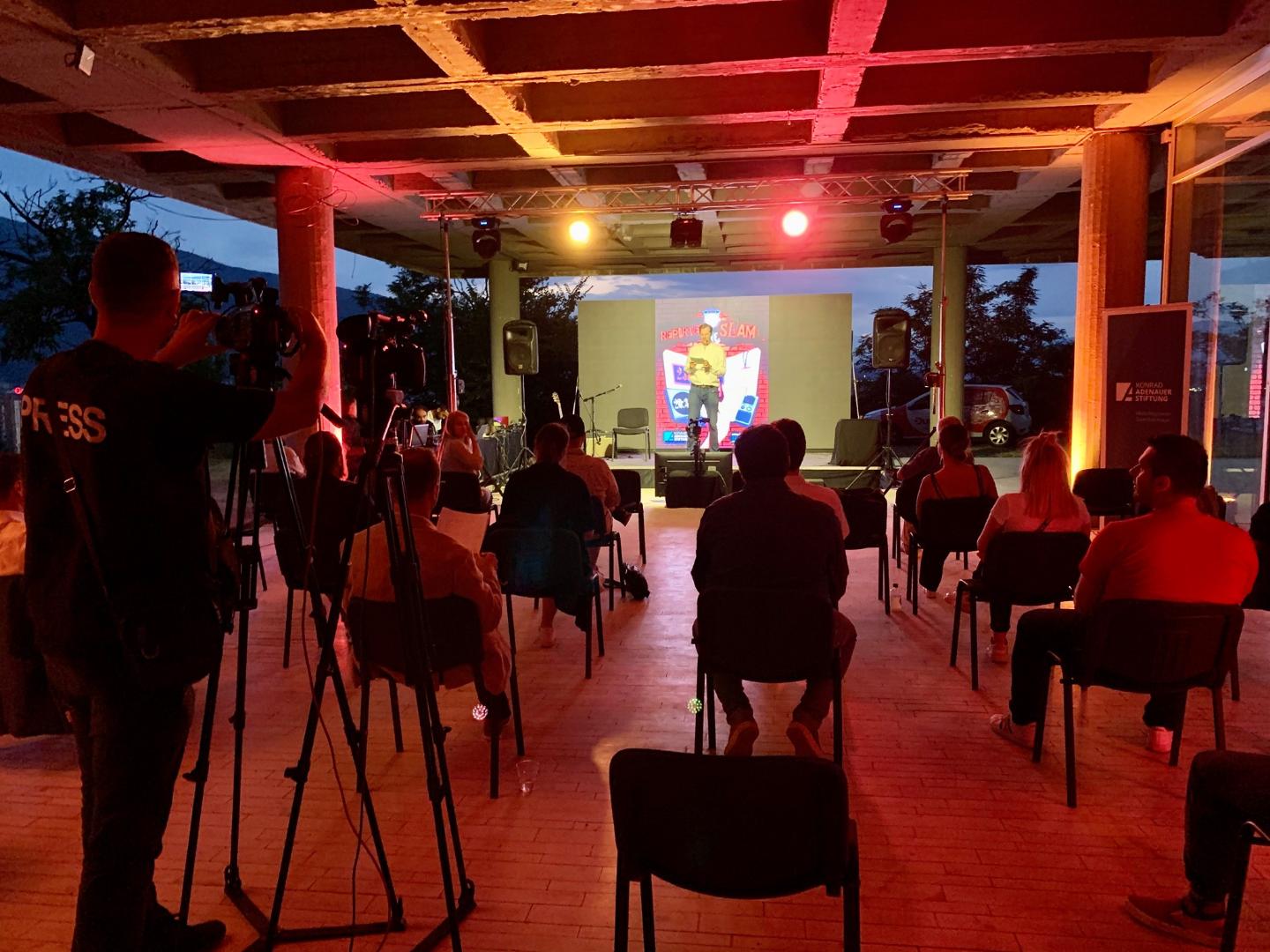 Fünf junge südosteuropäische Journalistinnen und Journalisten traten am 2. Juli auf der Bühne des Museums für zeitgenössische Kunst in der Hauptstadt Skopje auf: Una Hajdari (Kosovo), Ana Benacic (Kroatien), Aleksandar Brezar (Bosnien und Herzegowina) sowie Saska Cvetkovska und Bojan Stojkovski (beide Nordmazedonien). Auf unterhaltsame Art und Weise erzählten sie in ihren Präsentationen über eigene zum Teil investigative Recherchen. Una Hajdari stellte ihr Projekt in Kooperation mit Ai Weiwei dar und fokussierte auf die Herausforderungen beim Versuch, ein Klavier in ein Flüchtlingslager in Griechenland zu liefern. Bojan Stojkovski präsentierte die seltene Zufälligkeit, dass man zwar eine Person mit dem richtigen Namen gefunden hat, aber diese Person dann doch die falsche Person ist und zog die Schlussfolgerung, dass man sich auf Freunde auch bei der Arbeit verlassen kann. Ana Benacic erzählte über die verschiedenen Ursprungstheorien der Covid-Pandemie und die Herausforderung von Fact-Checkern, in der Covid-Pandemie zu prüfen, ob man Atemmasken backen kann. Eine investigative Reportage über einen Friedhof in Bosnien und Herzegowina, auf dessen offizieller Adresse auch ein Schönheitssalon angemeldet ist, stand im Mittelpunkt der Präsentation von Aleksandar Brezar.