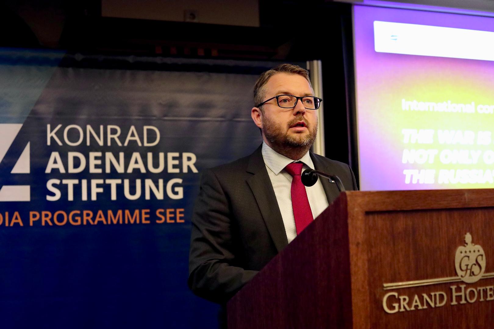 Zum Schluss der Konferenz sprach Ognyan Minchev, Vorsitzender des Verwaltungsrats des Instituts für Regionale und Internationale Studien Sofia, über die Risiken hybrider Kriege im Allgemeinen und konzentrierte sich dabei auf die Situation in Bulgarien und die Frage, warum russische Propaganda in der Gesellschaft Fuß fasst.