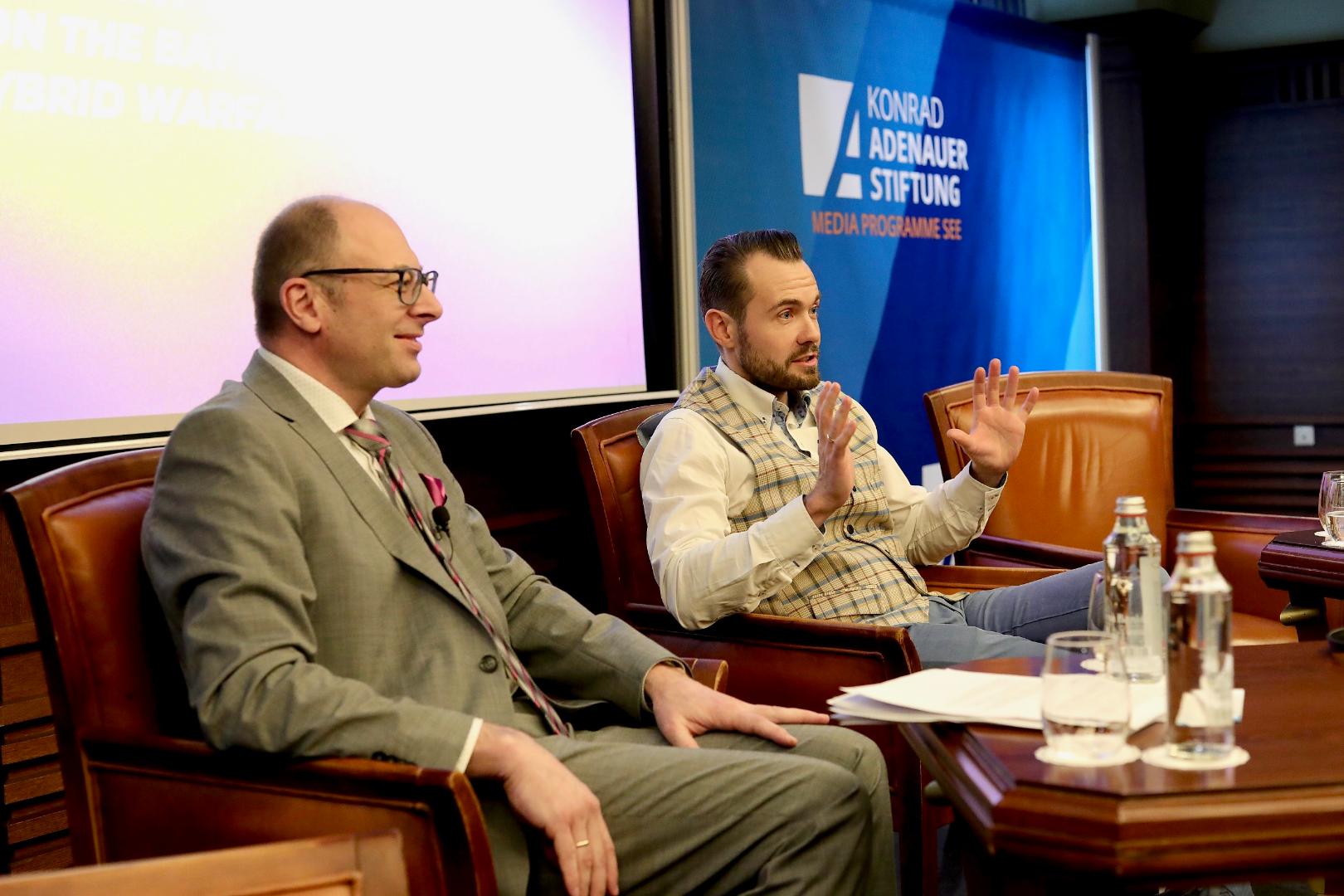 Das dritte Panel, moderiert von Michael Martens, Südosteuropa-Korrespondent der Frankfurter Allgemeinen Zeitung, befasste sich mit den Risiken für die südosteuropäischen Länder, die durch hybride Bedrohungen hervorgerufen werden. Diese Länder seien besonders anfällig für die hybriden Aktivitäten Russlands und anderer Staaten. Die Frage, welche die größte Bedrohung sei und wie man mit ihr umgehen solle, war das Hauptthema des Panels. Die Experten (Rumena Filipova, Vladimir Shopov und die Journalisten Sasa Dragojlo aus Serbien und Rusland Trad aus Bulgarien) diskutierten den Einfluss ausländischer Mächte im Balkan. Dabei wurden mehrere Schwächen dieser Länder thematisiert, die sie laut Expertenmeinung verwundbar machen.