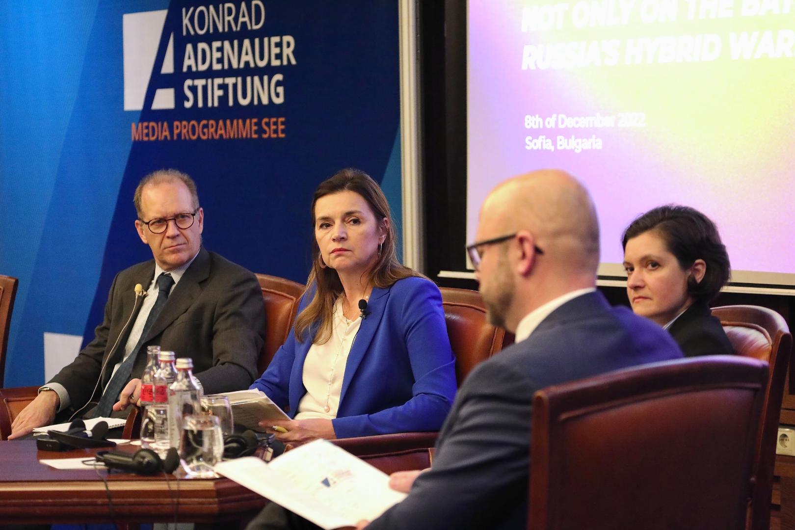 Das zweite Panel, moderiert von Kristina Baxanova, Leiterin der internationalen Nachrichtenredaktion des Fernsehsenders bTV, widmete sich der Analyse der Technologie und der Formen russischer hybrider Kriegsführung sowie der Rolle der traditionellen und sozialen Medien bei der Bekämpfung dieser Bedrohung. Mykola Davydiuk, ukrainischer Politikwissenschaftler und Autor, erklärte, dass die russische Desinformation aggressiver geworden sei, aber nicht mehr so intelligent agiere und ihr Hauptziel derzeit Europa sei. Putin habe jahrzehntelang viel Geld in die Verbreitung von Desinformationen gesteckt; traditionelle Medien könnten da nicht mithalten. Davydiuk zufolge ist das russische Narrativ nicht mehr so hybrid, wie es 2014 der Fall war. Damals war es Russlands Ziel zu manipulieren und zu verändern. "Wir befinden uns jetzt in einem blutigen Krieg, der uns in die Vergangenheit zurückführen will", erklärte er. Laut Todor Galev vom Center for the Study of Democracy gehört Bulgarien zu den Ländern, in denen Russland all seine hybriden Instrumente einsetzt: "Die Medien sind nur eine der Waffen - die Bulgaren sehen die russische Desinformation jeden Tag." Russland setzt aber auch Cyberangriffe, die Beseitigung unbequemer Personen und andere Formen der Kriegsführung ein. Galev führte auch weitere Beispiel wie den Hackerangriff auf die Internetseite der bulgarischen Post, die der Zentralen Wahlkommission im Jahr 2015 sowie die des Staatspräsidentenamts und verschiedener Ministerien auf. Er erinnerte auch an die russische Verbindung bei der Vergiftung von Emilian Gebrev und sagte, dies sei Teil von Putins Werkzeugen. Nikola Dujovski von der Universität Skopje nannte ein weiteres Beispiel für Russlands hybride Kriegsführung. Er sagte, dass in Nordmazedonien seit Oktober etwa 368 Signale für Bombendrohung in Gymnasien in ganz Skopje empfangen wurden. Die meisten dieser Signale werden von Servern in Russland gesendet. Das Ziel sei es, "Angst und Panik bei Eltern und Angehörigen zu erzeugen", was eine weitere Taktik der hybriden Kriegsführung sei. Der Journalist Fabien Zamora von Agence France-Press berichtete, dass die französischen Medien sehr erfolgreich mit effektiven Fact-Checking-Plattformen arbeiten, aber nicht alle Medien die Mittel haben, für diese Plattformen aufzukommen. Ein unlösbares Problem bleiben die geschlossenen Social-Media-Gruppen auf Facebook und Telegram, im Rahmen derer ungeprüfte Informationen problemlos verbreitet werden.