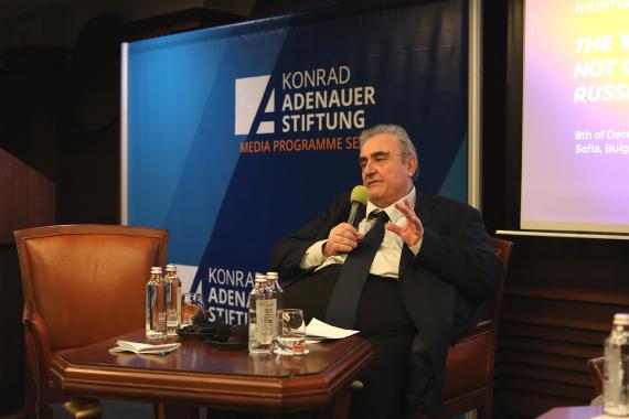 Die Teilnehmer des ersten Panels, moderiert von Petar Karaboev, stellv. Chefredakteur des Online-Nachrichtenportals Dnevnik.bg, diskutierten die Folgen des Russischen Angriffskrieges für den internationalen Frieden, die Sicherheit und die internationale Rechtsordnung. Die Direktorin des Griechischen Instituts für Internationale Beziehungen, Despina Afentouli, erklärte, „dass wir immer noch über den Krieg in der Ukraine sprechen als ob er irgendwo anders stattfände. In der öffentlichen Debatte findet der Krieg außerhalb Europas statt, aber in der Praxis ist er mitten in Europa.“ Besonderes Augenmerk richtete sie auf die westlichen Balkanstaaten und stellte fest, „dass Russland vor uns da sein wird, wenn der Prozess der Integration nicht beschleunigt wird." Ihrer Meinung nach ist die NATO das einzige Bündnis für kollektive Sicherheit in Europa, und zwar mit Unterstützung der USA. Ein weiterer Referent, General Erhard Bühler, machte auf die wichtige Rolle des NATO und den EU-Zusammenhalt angesichts der russischen Aggression in der Ukraine aufmerksam. Auch Vessela Cherneva, stellv. Direktorin des European Council on Foreign Relations und Leiterin des ECFR-Büros in Sofia, betonte, dass das Thema Ukraine-Krieg auch ein Thema über die Zukunft der Europäischen Union sei.