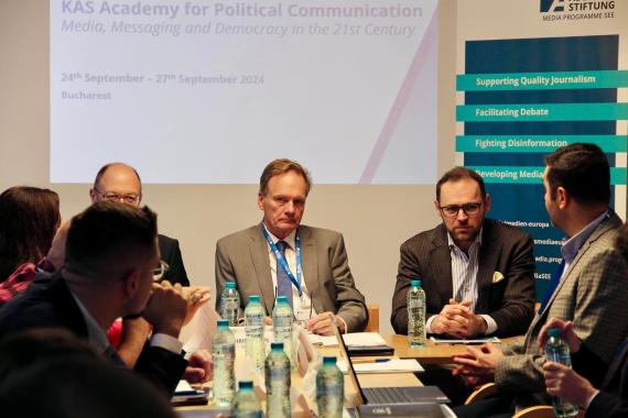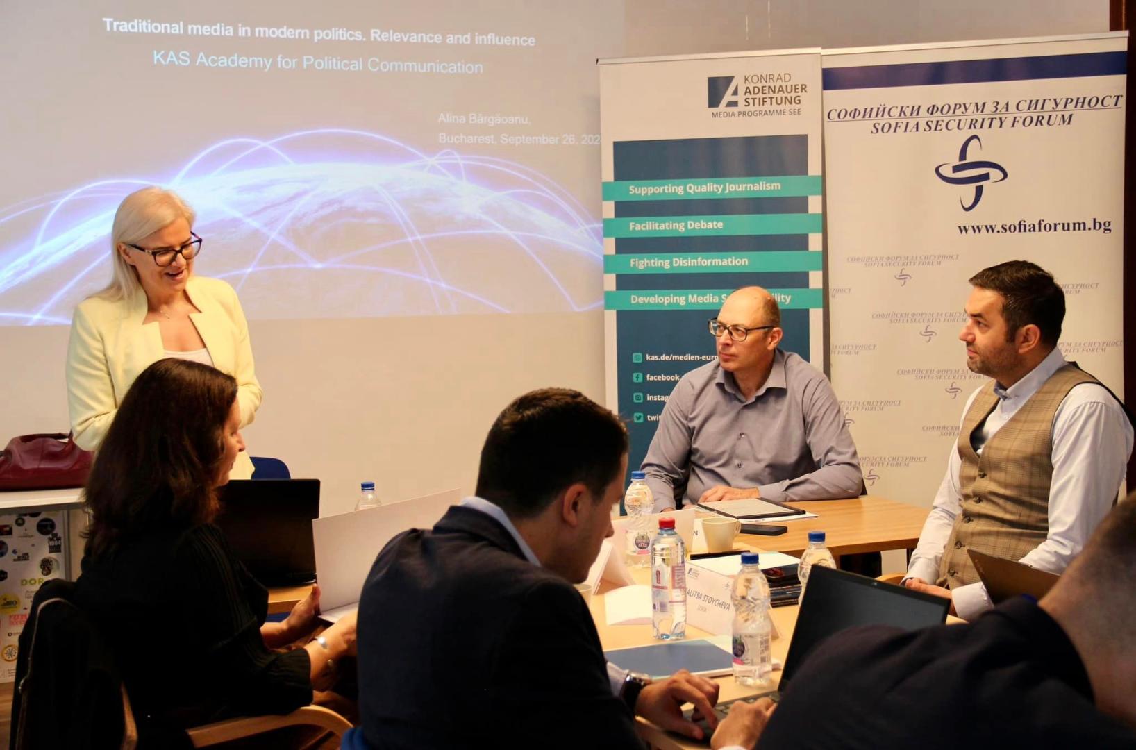 This year, the event brought together political communicators, journalists, and experts from across South East Europe and Germany who discussed current challenges of political communication in today’s media landscape. The Academy was opened by Christoph Plate, Director of the KAS Media Programme, and Yordan Bozhilov, Chairman of the Sofia Security Forum. In his opening remarks, Plate highlighted the polarisation of societies and advised to reflect whether their messages are reaching their targeted audiences. The first day was dedicated to topics such as the differences of political communication in authoritarian and democratic regimes, strategic communication, and also the practical experience of the Republic of Moldova. Valeriu Pașa, Chairman of WatchDog.MD, Andrey Vladov, Head of the Russia Desk at BBC Monitoring, and Andrei Avram, a specialist in strategic communication and international policy planning, underlined that StratCom is not just a nice word but a key component in safeguarding national resilience.
