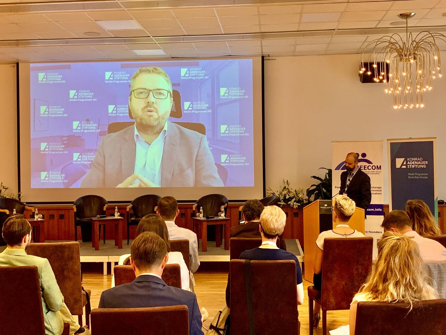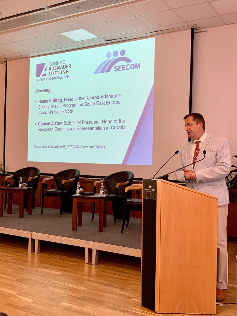 Hendrik Sittig, Leiter des KAS-Medienprogramms Südosteuropa, und Ognian Zlatev, SEECOM-Präsident und Leiter der Vertretung der Europäischen Kommission in Kroatien, eröffneten die Konferenz. Vuk Vujnović, SEECOM-Generalsekretär übernahm die Moderation. „Die Verbreitung von Desinformation und Fake News sind Phänomene, die das Vertrauen in demokratische Institutionen, in Behörden, Regierungen, die Europäische Union und auch in traditionelle Qualitätsmedien erheblich schwächen können“, so Hendrik Sittig. „Hier sind gezielte Maßnahmen nötig, um die Widerstandsfähigkeit gegen solche Angriffe zu stärken, das Vertrauen wiederherzustellen, aber auch die Medienkompetenz bei Jugendlichen und Erwachsenen zu stärken.“ Ognian Zlatev betonte in seiner Eröffnungsrede, dass die negativen Folgen der Corona-Pandemie und deren erheblichen Einfluss auf die Mediensphäre nicht zu unterschätzen seien.