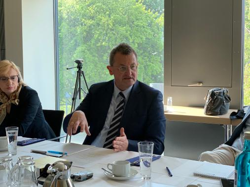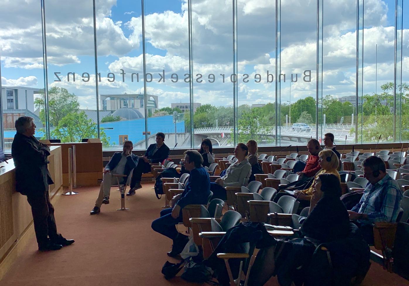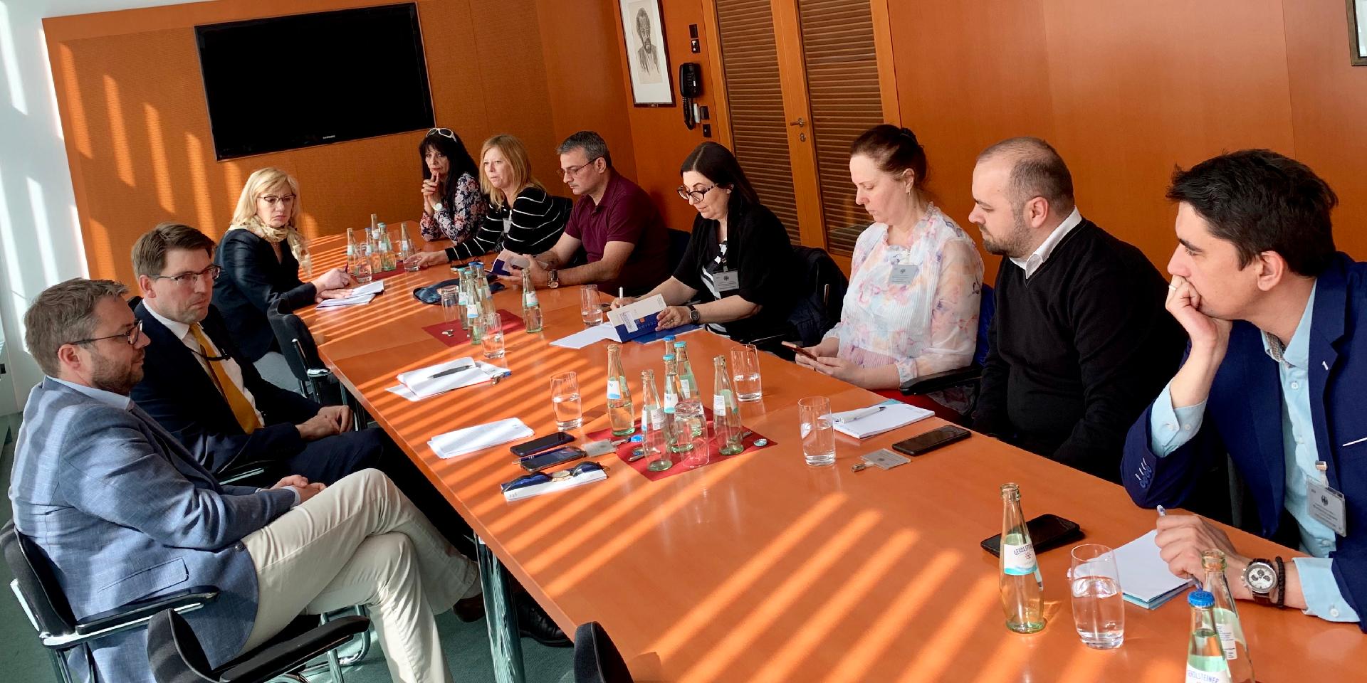 Die erste Station der Reise war der Besuch des Rundfunks Berlin-Brandenburg (rbb). Dort begrüßte Hendrik Sittig, Leiter des KAS-Medienprogramms, die Gäste aus Südosteuropa, stellte die Arbeit des Medienprogramms vor und gab eine kurze Einführung in die Themen der Informationsreise. Anschließend fand eine Diskussion mit der ARD-Generalsekretärin Dr. Susanne Pfab statt. Sie gab einen Überblick über die Entstehung des öffentlich-rechtlichen Rundfunks in Deutschland und den Aufbau der ARD. Frau Pfab erklärte, dass die dezentralisierte Struktur, die Zusammensetzung der Gremien und die Finanzierung aus Rundfunkbeiträgen für politische Unabhängigkeit sorgen und eine freie Mandatserfüllung ermöglichen. Im Anschluss erklärte Dr. Jan Schulte-Kellinghaus, Programmdirektor beim rbb, wie das Fernsehen, die Radioprogramme und Online zusammenarbeiten und gemeinsame Projekte beim rbb entstehen. In Bezug auf multimediales Arbeiten ist der rbb ein Vorreiter in der ARD. In dem Gespräch wurde ebenfalls das Thema Kontrollgremien und deren Einfluss auf das Programm angesprochen. Hierbei betonte Schulte-Kellinghaus: „Der Rundfunkrat sagt uns nicht, worüber wir berichten sollen, sondern berät uns lediglich." Dies wurde am nächsten Vormittag von der Vorsitzenden des rbb-Rundfunkrats Pfarrerin Friederike von Kirchbach bestätigt: „Wir greifen nicht in die Autonomie ein, sondern kritisieren und loben im Nachhinein."