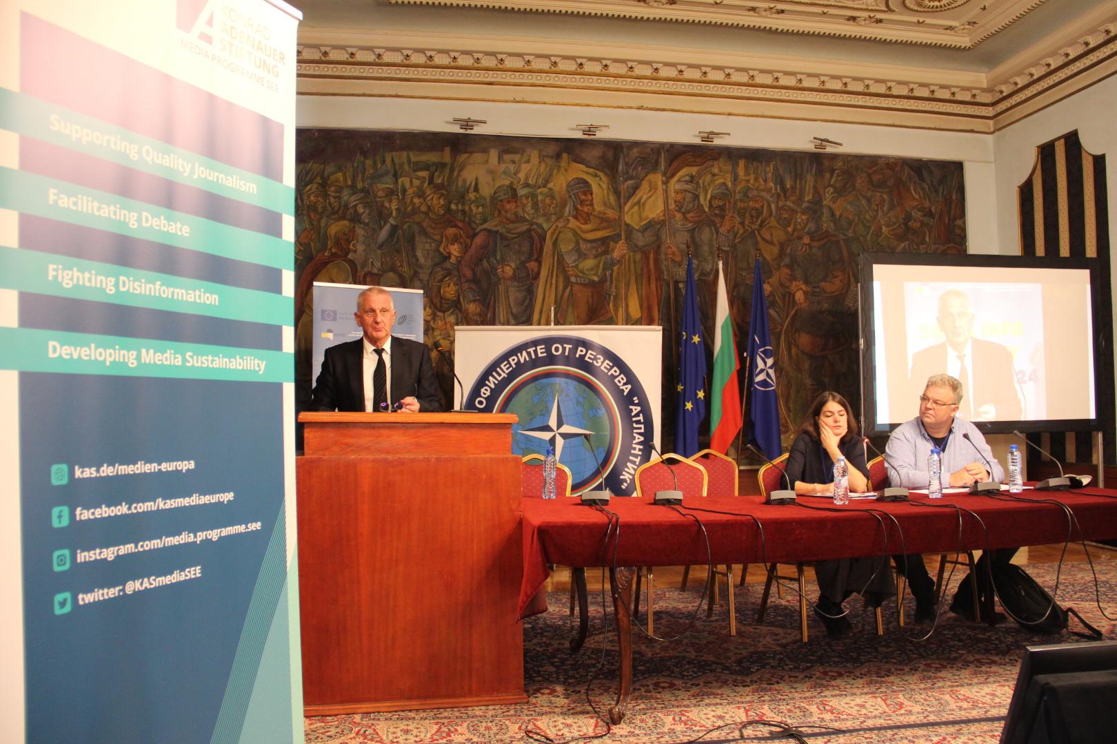 The Media Programme South East Europe of the Konrad-Adenauer-Stiftung hosted a panel on narratives as warfare on the first day of the conference. “In an age of instant information flows across borders, narratives are not just tools of communication, they can be tools of control and persuasion” Ralitsa Stoycheva, Research Associate of the KAS Media Programme, opened the discussion. During the panel three different perspectives were presented. Vladimir Shopov, Research Fellow at the European Council on Foreign Relations, explained the China’s geopolitical efforts to construct and project its narrative infrastructure in Southeast Europe. Milorad Ivanovic, Editor-in-chief of the Balkan Investigative Reporting Network Serbia, spoke about controversies in the Serbian society regarding the Russian narratives. Halyna Tanai, Chief Operating Officer of the NGO Lviv Media Forum, pointed out the importance of leaving foreign narratives behind and focus on building healthy dialogue within the Ukrainian society with own, trustworthy messages.