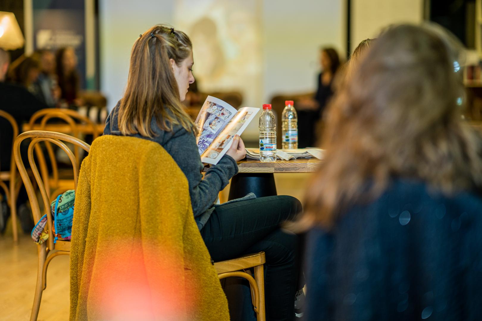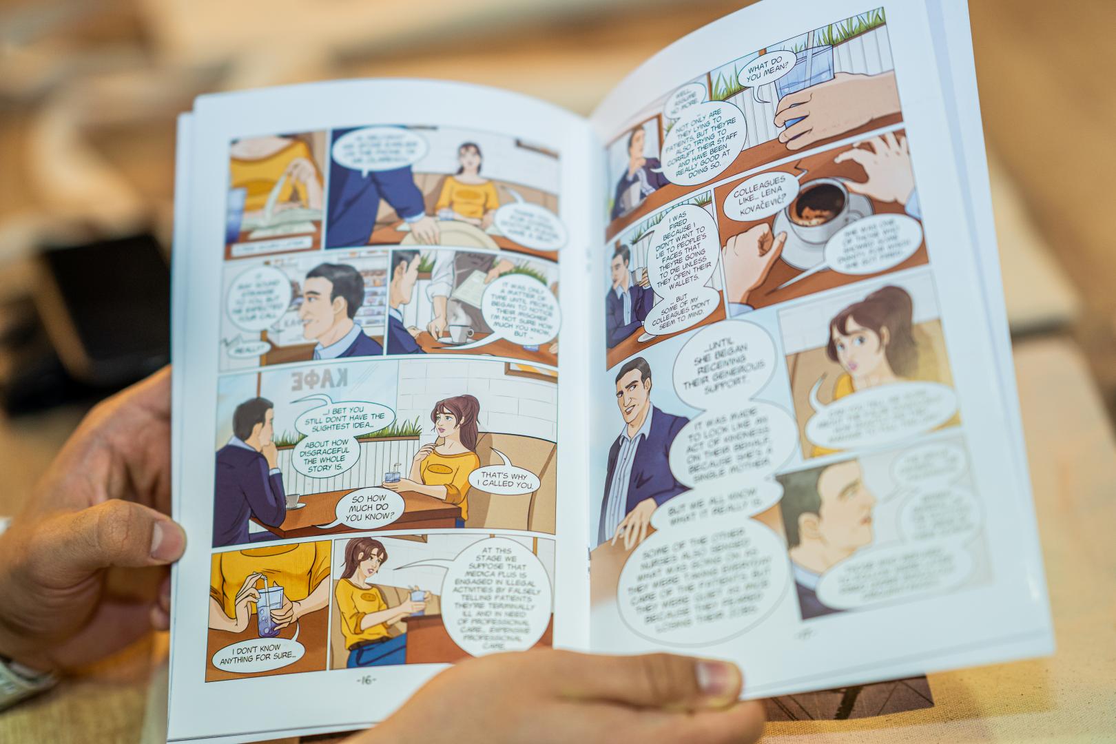 Die beiden Autorinnen Alexia Petrova (Journalistin) und Ralitsa Tschobanova (Zeichnerin) aus Sofia stellten dem Publikum in einer Kurzfassung die Hauptfiguren und die Handlung des Comics vor: Die junge Journalistin Delyana kommt während eines Praktikums bei einer größeren Zeitung den korrupten Machenschaften eines Gesundheitsunternehmens auf die Spur. Mithilfe ihres älteren Kollegen Simeon beginnt sie eine Recherche und hat mit immer neuen Hindernissen zu kämpfen. Bei all dem gibt sie nicht auf. „Korruption ist ein großes Problem“, erzählte Alexia Petrova. „Ich wollte zeigen, an welchen Stellen Korruption herrscht und dass wir keine Angst haben sollten, sie zu bekämpfen.“