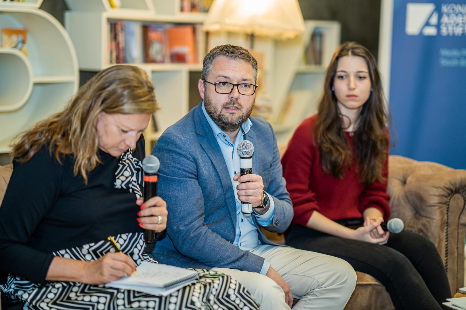 Kristina Baxanova eröffnete die Runde mit der Frage, welche Rolle Journalistinnen und Journalisten in der bulgarischen Gesellschaft spielten. Dazu Dimitar Ganev: „Als Journalisten dürfen wir nicht erwarten, dass wir gern gesehen werden. Sollten wir also mal irgendwo mit einem roten Teppich empfangen werden, sollte bei uns ein rotes Licht angehen.“ Die vier Panelisten waren sich einig, dass diese skeptische Grundhaltung gegenüber Journalisten Probleme zur Folge hat: Behörden und Unternehmen beantworteten ungern Fragen, kämen ihrer Auskunftspflicht nur widerwillig nach. Es sei oft auch schwierig, an Informationen zu gelangen, die eigentlich öffentlich zugänglich sein müssten.