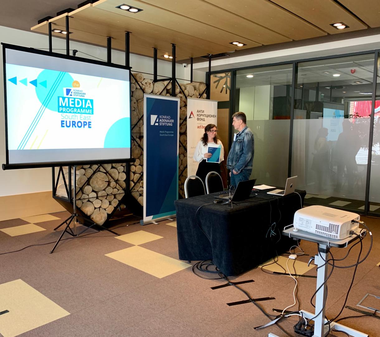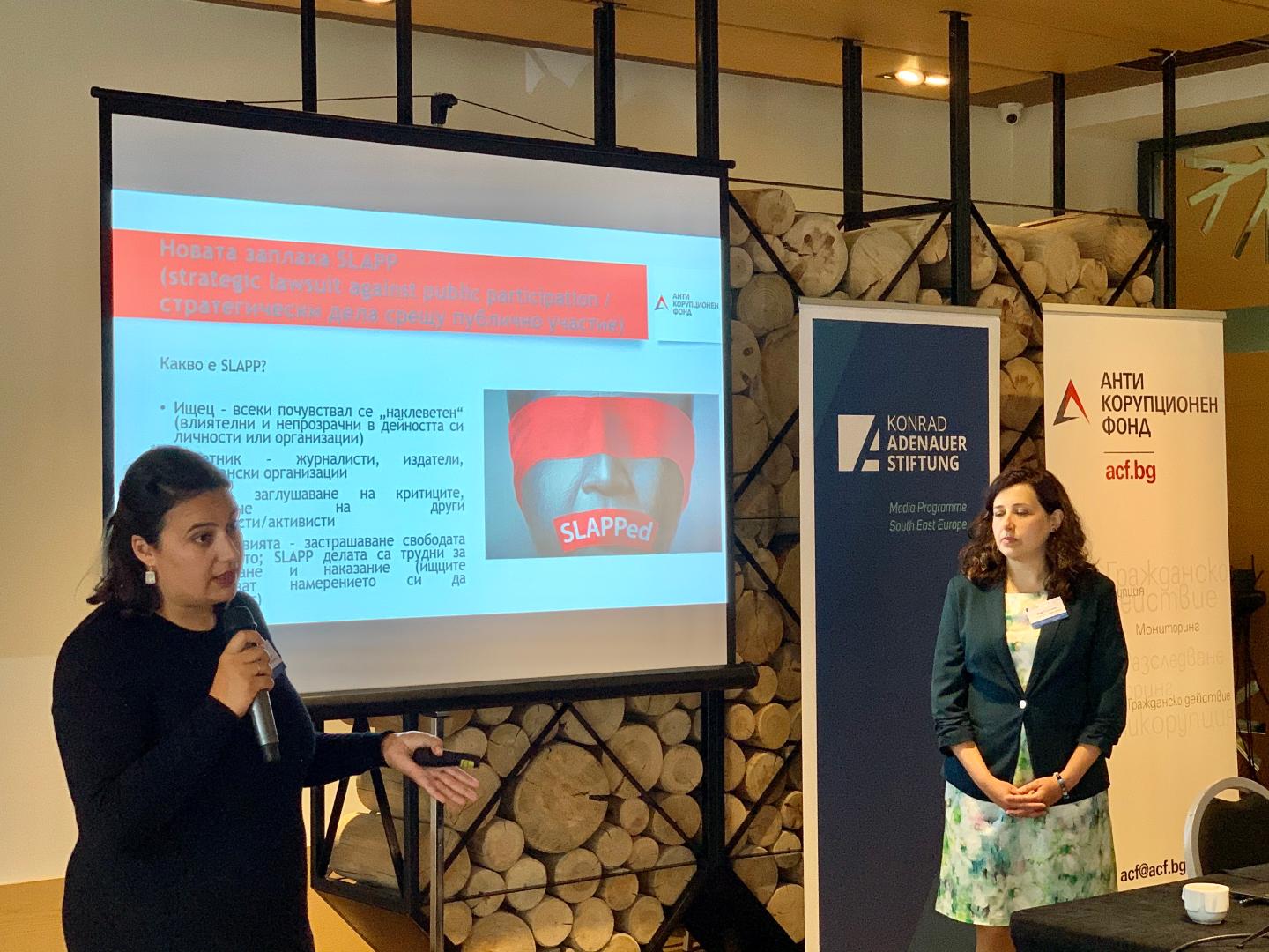 Lora Georgiеva, Koordinatorin des Rechtsprogramms des Antikorruptionsfonds, und Sofia Zheleva, Rechtsexpertin des Antikorruptionsfonds, stellten rechtliche Rahmen und verfügbare Instrumente zur rechtlichen Unterstützung unabhängiger Journalisten dar. Auf europäischer Ebene fokussierten sie auf die Entwicklung der Anti-SLAPP- Rechtsvorschriften der Europäischen Kommission (SLAPP = strategic lawsuit against public participation) und auf nationaler Ebene – auf das Gesetz über den Zugang zu öffentlichen Informationen.