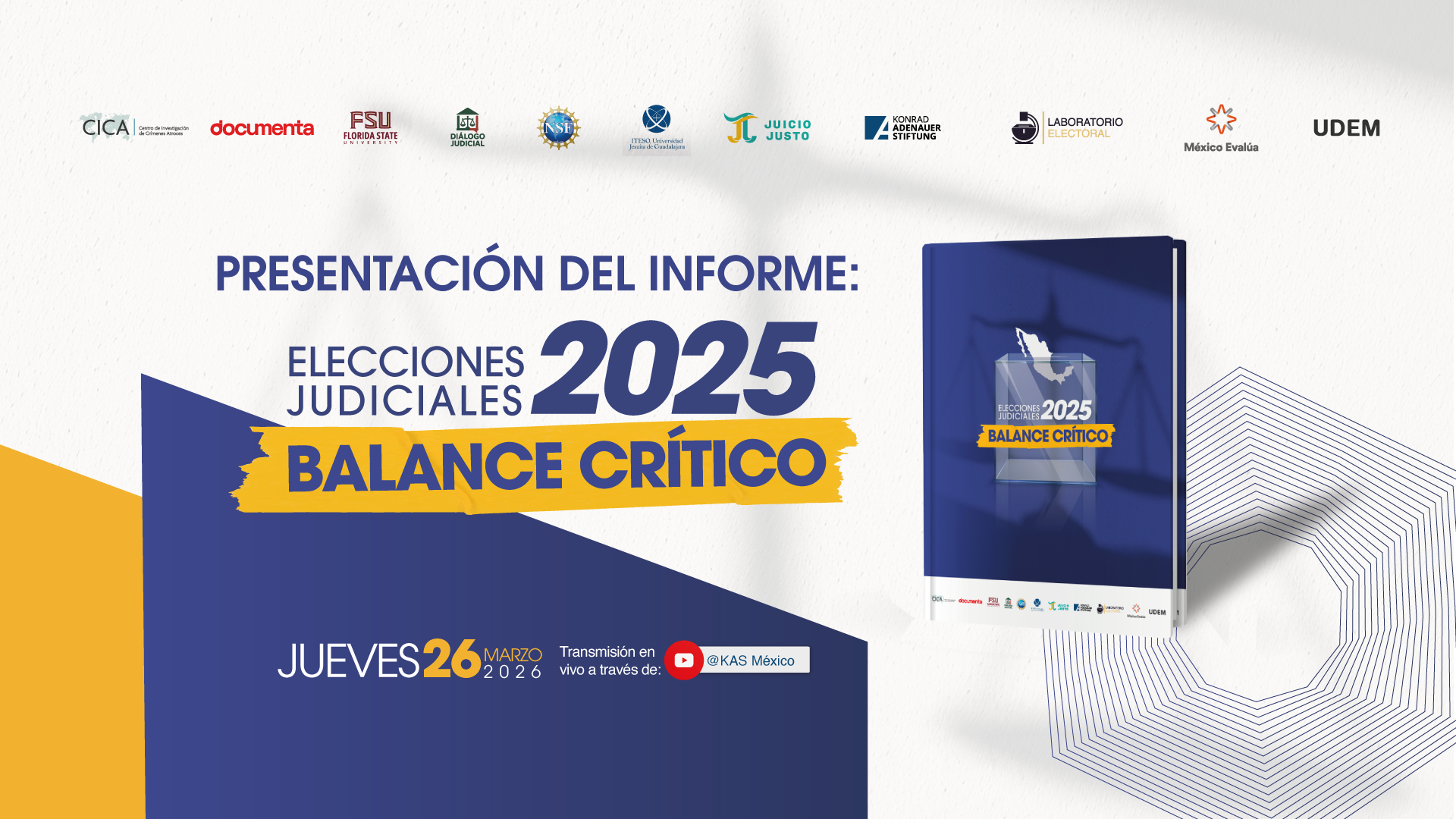 Die Vorstellung des Berichts wird von einer Gesprächsrunde mit Autorinnen und Autoren der Publikation begleitet, darunter Laurence Pantin, Arturo Espinosa Silis, Juan Morey, Susana Camacho und Miroslava Ortiz. Ziel der Veranstaltung ist es, eine öffentliche und informierte Debatte über die Richterwahl von 2025 anzustoßen.