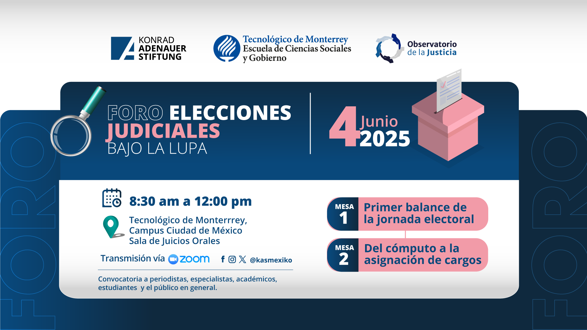 Die Konrad-Adenauer-Stiftung Mexiko und die Beobachtungsstelle für das Justizwesen des Tecnológico de Monterrey laden Sie zum Forum „Richterwahlen im Fokus“, ein, einem Raum für Analysen und Überlegungen zu verschiedenen Aspekten der Justizwahlen, die am 1. Juni 2025 in Mexiko stattfanden.