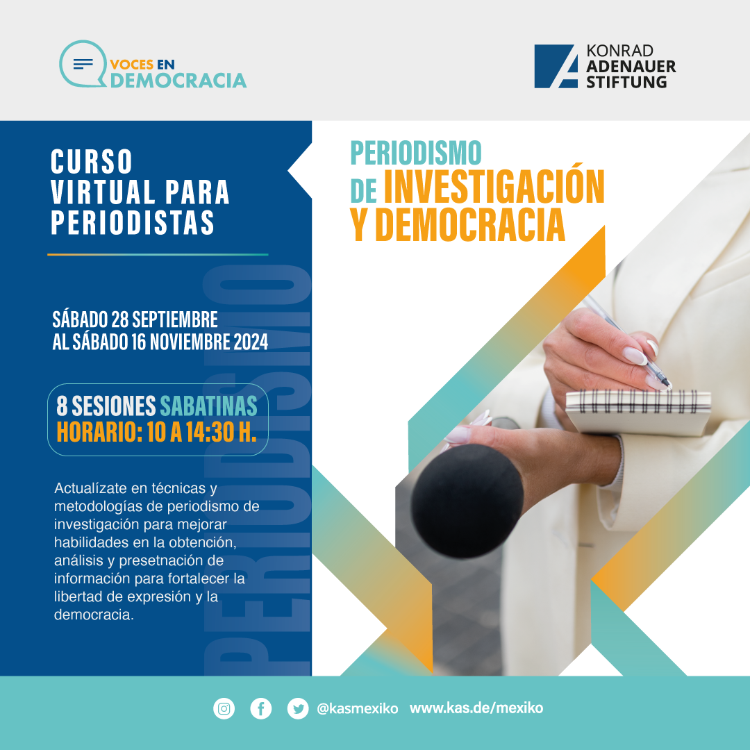 La Fundación Konrad Adenauer en (KAS) México organiza el curso virtual "Periodismo de investigación y democracia", con el cual se busca brindar herramientas a periodistas mexicanos especializados en periodismo de investigación, periodismo digital y de datos, así como acceso a la información y ética periodística.