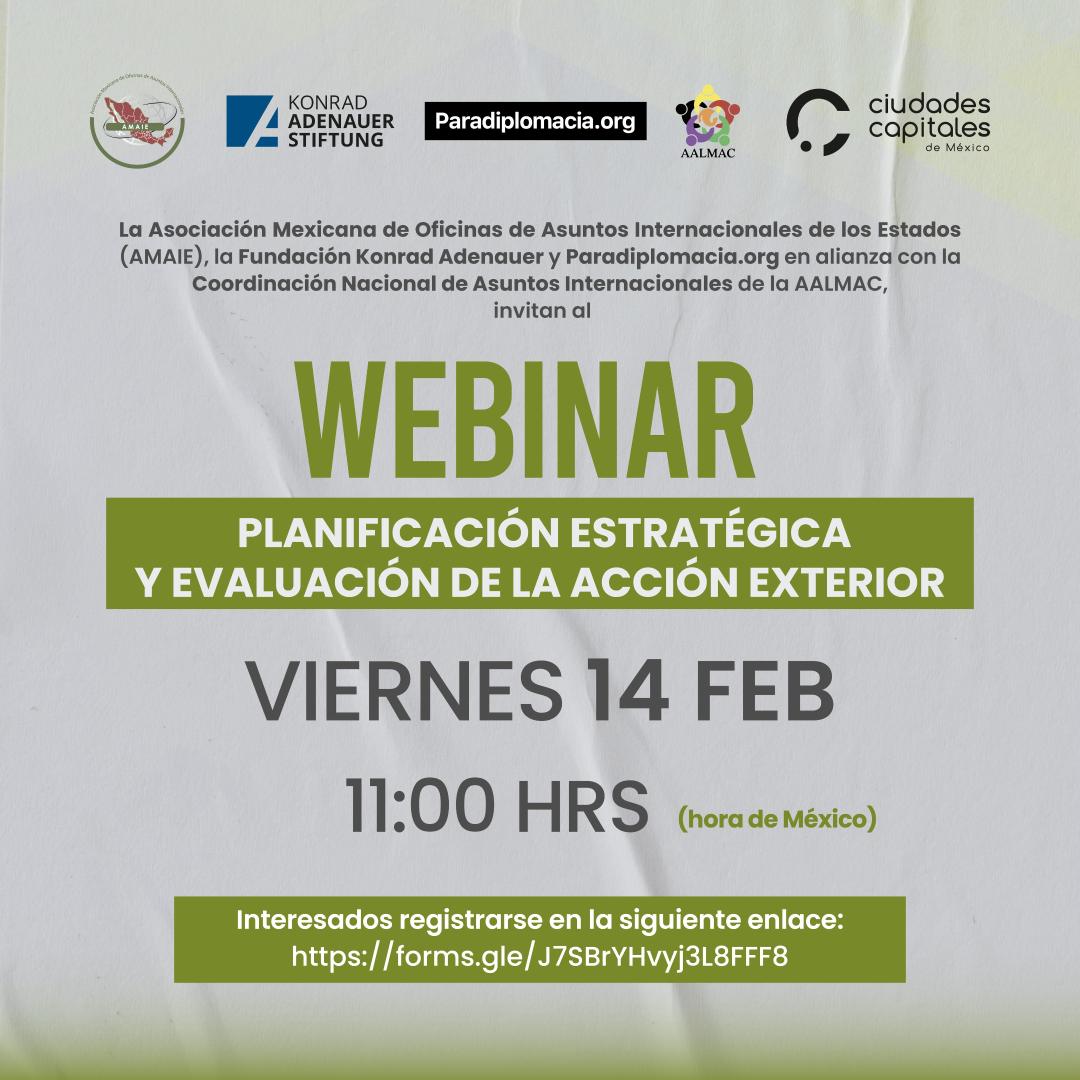 Die Konrad Adenauer Stiftung in Mexiko lädt Sie in Zusammenarbeit mit Paradiplomacia.org und der Nationalen Koordinierungsstelle Internationaler Angelegenheiten AALMAC, A.C. zum Webinar "Strategische Planung und Evaluierung der lokalen externen Maßnahmen, die darauf abzielen, die Instrumente, Stärken und Möglichkeiten für die strategische Planung lokaler internationaler Maßnahmen vorzustellen."