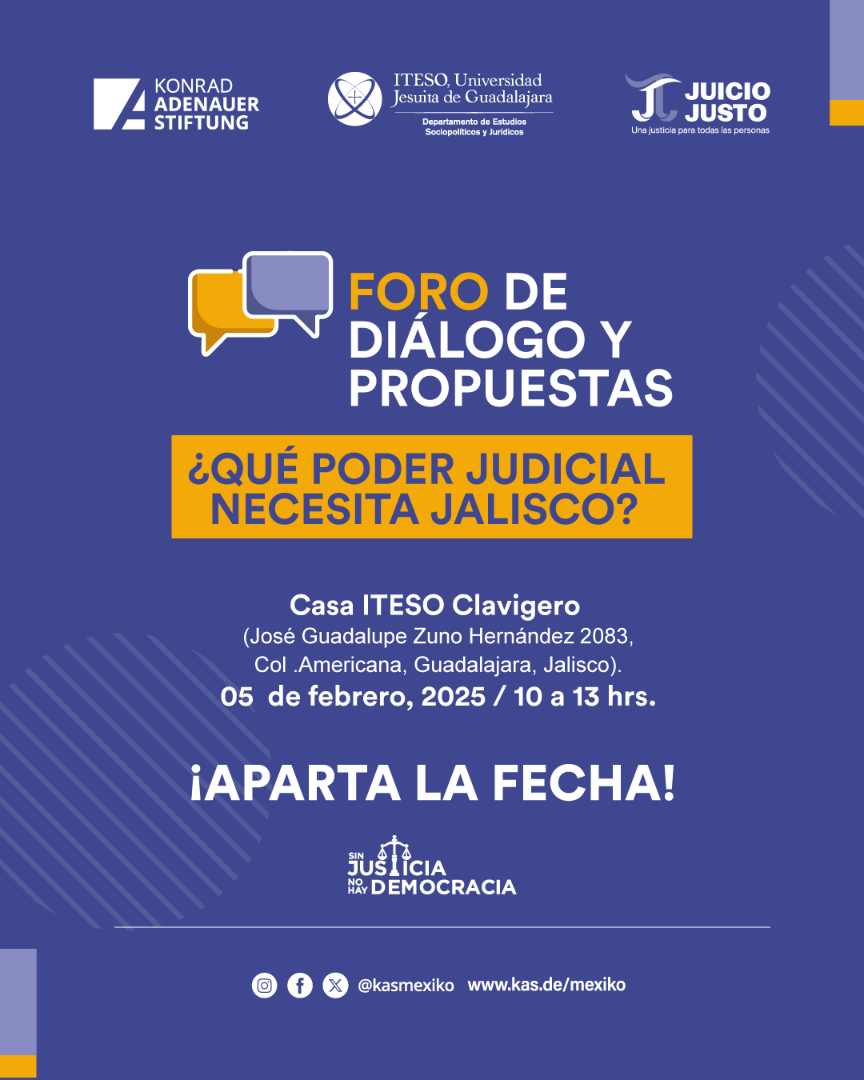 La Fundación Konrad Adenauer (KAS) en México, en colaboración con la Universidad Jesuita de Guadalajara (ITESO) y la organziación Juicio Justo, les invitamos al foro de diálogo y propuestas "¿Qué Poder Judicial necesita Jalisco?