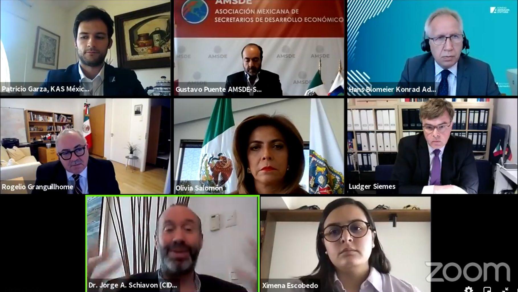 An dem virtuellen Workshop nahmen Hans Blomeier, Leiter des Auslandsbüros Mexiko der KAS, Ximena Escobedo, Generaldirektorin der Politischen Koordination des SRE, Jorge Schiavon, Abteilung für Internationale Studien, CIDE, Carmen Mireya Calderón, Wirtschaftsministerin des Bundesstaates Puebla, Ludger Siemes, Leiter des Referats für Internationale Angelegenheiten für Europa der Staatskanzlei des Landes Nordrhein-Westfalen, Deutschland und Rogelio Granguillhome, Botschafter Mexikos in Deutschland, teil.