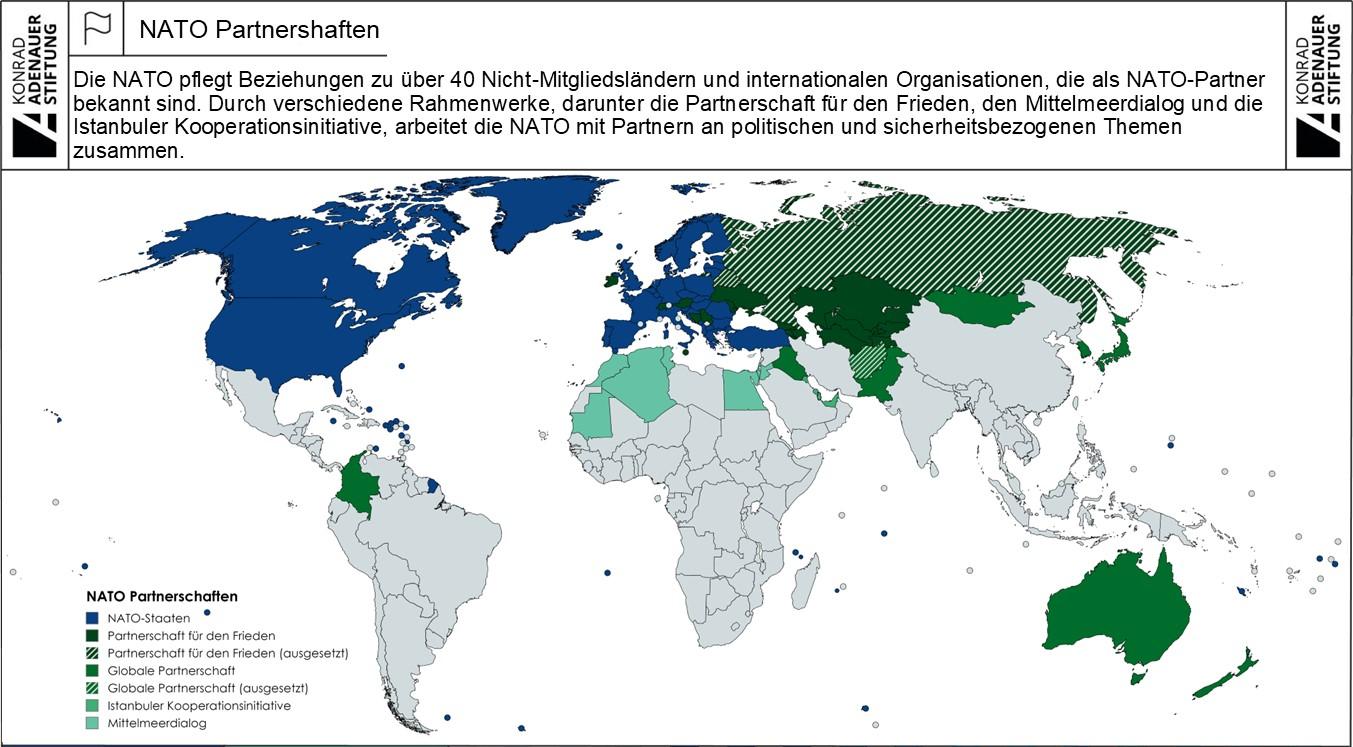 - Derzeit hat die NATO ihre Partnerschaften mit Russland, Belarus und Afghanistan ausgesetzt.