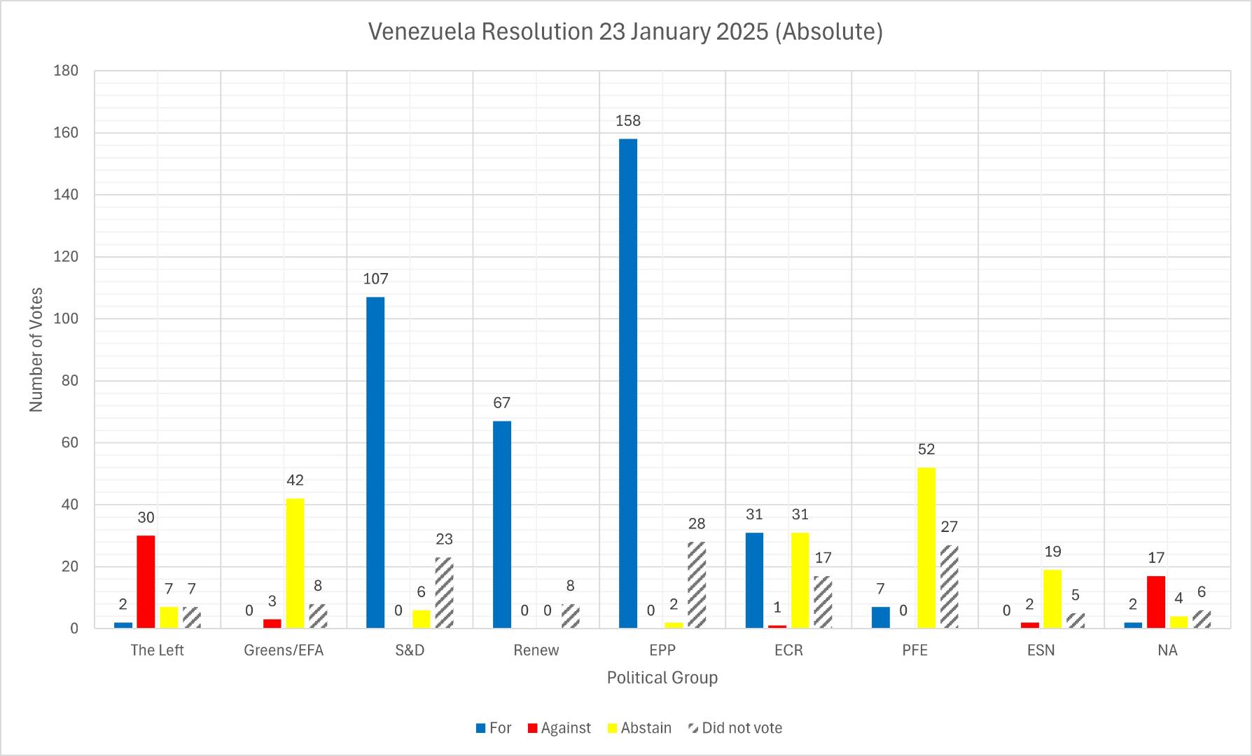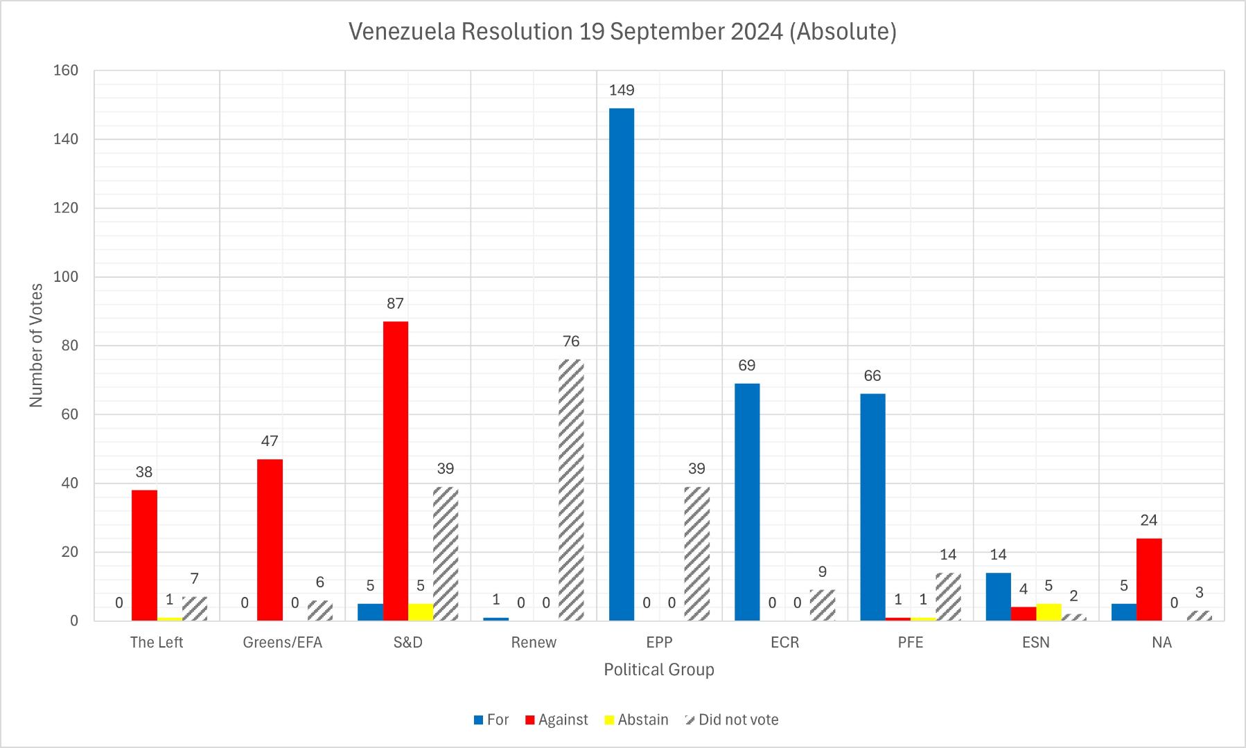 In the January resolution, MEPs called for expanded sanctions targeting Nicolás Maduro, his inner circle, and key officials responsible for repression. The vote in January saw 374 votes in favour, 53 against, and 163 abstentions. Compared to the September vote, the number of abstentions in January increased significantly, while fewer MEPs voted against the resolution. Remarkably, the S&D voted against the resolution in September but supported the one in January. Additionally, the far-right Patriots for Europe group abstained in much larger numbers in January.
