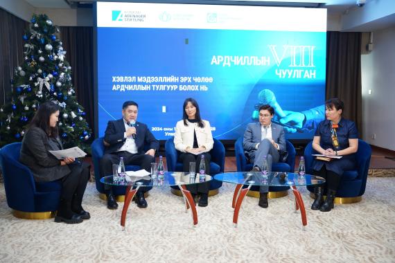 Dieses Jahr fand der VIII. Demokratiekongress statt, er wurde gemeinsam von der Konrad-Adenauer-Stiftung, dem Presseinstitut und der NGO Globe International organisiert und bot eine Plattform für den Austausch zwischen Journalisten und Juristinnen sowie politischen Entscheidungstragenden. Der Demokratiekongress widmet sich jährlich gesellschaftlich relevanten Themen, die in kurzen Vorträgen sowie verschiedenen Podiumsdiskussionen aufgearbeitet werden. Im Zentrum des VIII. Demokratiekongresses standen aktuelle Entwicklungen im Bereich der Medienfreiheit in der Mongolei, insbesondere der Entwurf für ein neues Gesetz zur Medienfreiheit, das derzeit vom Ministerium für Inneres und Justiz erarbeitet wird.