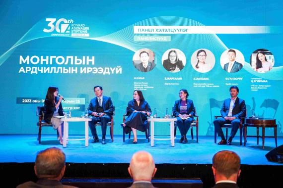 Anschließend an die Impulse und den Rückblick fand eine Podiumsdiskussion statt, die sich mit dem aktuellen Zustand und der Zukunft der mongolischen Demokratie beschäftigte. N. Uchral, Minister für digitale Entwicklung und Kommunikation der Mongolei, B. Jargalan, stellvertretende Vorsitzende der Demokratischen Frauenunion, B. Zolzaya, Gründerin der Nichtregierungsorganisation Women for Change, und der Wirtschaftswissenschaftler und Unternehmer, O. Ganzorig, diskutierten die Herausforderungen vor denen die junge Generation steht. Dabei standen ähnlich wie in Deutschland Themen wie Politikverdrossenheit, schwindende Mitgliederzahlen und schwieriger Generationswechsel in den Parteien sowie das fehlende Vertrauen der Gesellschaft in die Politik im Fokus der Diskussion.