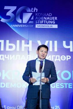Zu Beginn der Veranstaltung fand die Begrüßung der Teilnehmer durch den Minister und Kabinettschef, D. Amarbaysgalan, sowie durch die Verlesung des Grußwortes des mongolischen Präsidenten, U. Khurelsukh, von seinem außenpolitischen Berater, E. Odbayar, statt. In beiden Grußworten wurde die Rolle der KAS als zuverlässiger Partner der mongolischen Demokratie in den vergangenen 30 Jahren gewürdigt. Anschließend nutzten Christian Echle, Leiter der Asien- und Pazifikabteilung, und Viktor Frank, AM Mongolei, die Gelegenheit, um sich bei allen aktuellen und ehemaligen mongolischen Mitarbeiterinnen und Mitarbeitern sowie den zahlreichen Partnern für die sehr gute Zusammenarbeit zu bedanken. Beide Stiftungsvertreter unterstrichen insbesondere das tiefe Vertrauen der Mongolei gegenüber Deutschland und die große Aufgeschlossenheit gegenüber der Stiftung durch alle mongolischen staatlichen und zivilgesellschaftlichen Akteure.