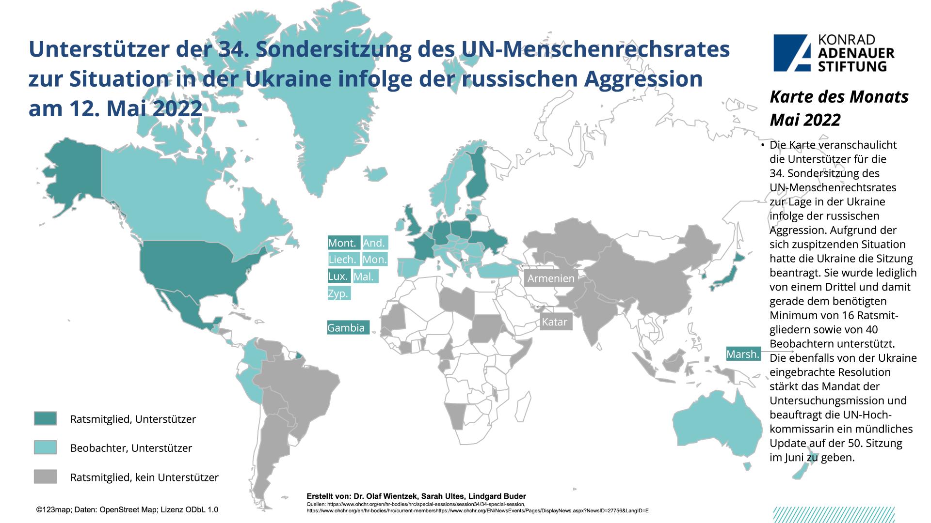 Am 12. Mai fand die 34. Sondersitzung des UN-Menschenrechtsrates zur sich verschlimmernden Menschenrechtslage in der Ukraine infolge der russischen Aggression in Genf statt. Die Ukraine hatte die Sitzung beantragt und auch einen eigenen Resolutionsentwurf eingebracht. Er wurde lediglich mit Gegenstimmen von China und Eritrea angenommen und stärkt das Mandat der Untersuchungsmission. Besorgt äußerten sich zahlreiche Diplomaten zudem zu den globalen Auswirkungen des Krieges auf Nahrungsmittel- und Energiesicherheit. Russland boykottierte die Sitzung.